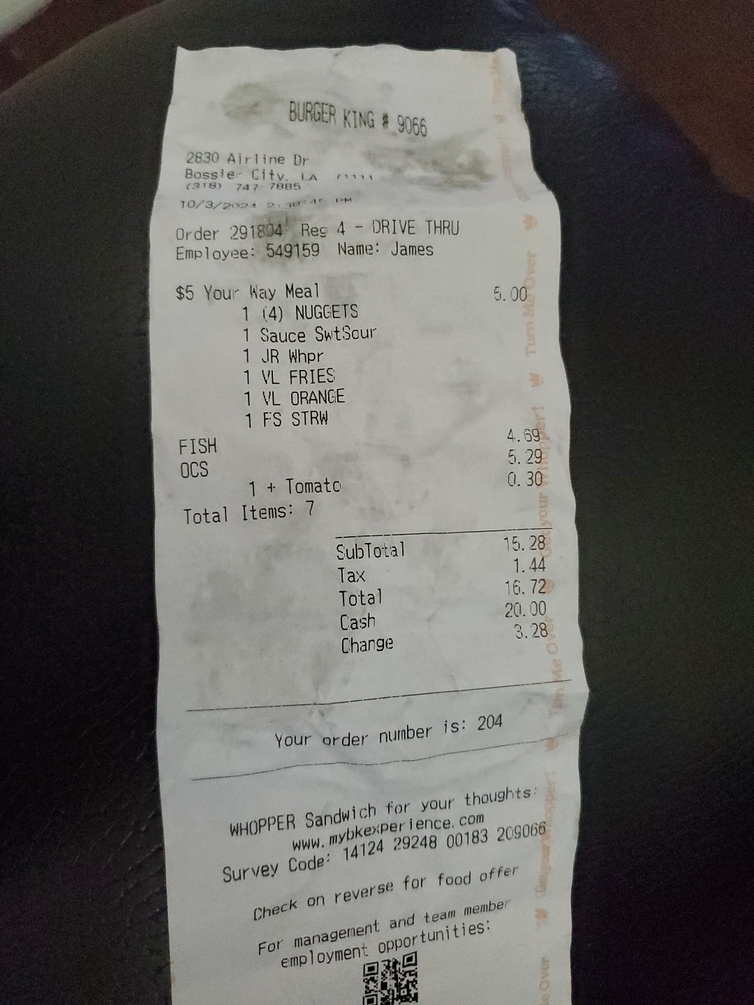 Read moreI hope someone reads this review from corporate. So yesterday, Sunday, April 10 at 5:20 pm I went to burger King for the 5 dollar deal on the two sandwiches. So I'm in the drive through and I'm told to hold so I'm sitting up there waiting for a couple minutes. When she finally comes picks I tell her what I want but quite confused at how I had to repeat my order because she up there talking or fussing with her co-workers so I get the king that's supposed to come with bacon two of the sandwiches and I get a strawberry Fanta and I was in the middle of not deciding whether I wanted onion rings or not so I'm like man how much is it going to be I just said never mind. She was so rude at the window waiting on my food and to pay she rolled her eye at me. Now for one I didn't do nothing to you so you need to come correct I get my food I'm driving down the street because I like to multitask while driving my burger was supposed to have bacon on it but it didn't. I'm...