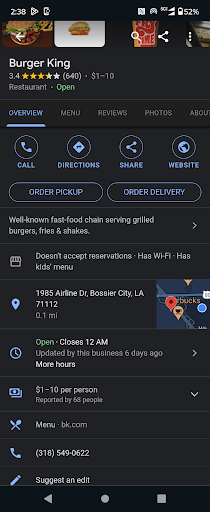 Read moreI stopped at the Burger King on Airline Drive just on I-20. It was approximately 10:00 PM. There was no one else in the drive thru so I ordered for my teenager and myself. The order taker answered Immediately. Since this was my first visit in several weeks I needed more time. I ordered the #1 Whopper value meal medium size. Next, I ordered a plain cheeseburger, an apple juice, and some chicken nuggets for my son. We paid at the second window and received our drinks. We had to pull forward and wait at the front door for our food to be brought out. The wait was just a few minutes. We then parked at the nearby Pierre Bossier Mall parking lot to consume our food. My fountain coke was great. My burger and toppings were fresh and tasty. The fries were hot and crispy. My son said his cheeseburger was fine, but the chicken nuggets were different. Burger King had changed their nuggets. These were softer, but good. We both preferred the other brand which had a thicker breaded crust and thicker meat. Even with the change our food was great. As usual prices had...