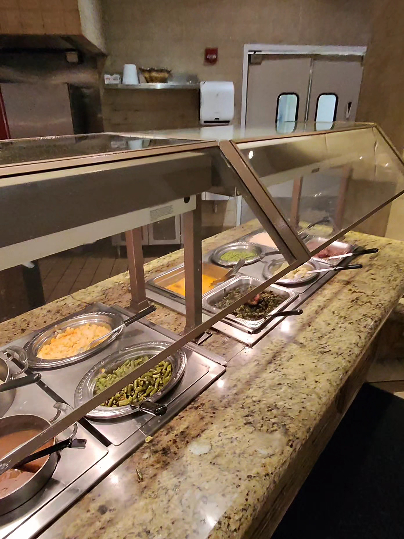First area: The Mac and cheese had some fake smoke on it that was a little off-putting, dry not creamy. Green beans were Italian style, fine but forgettable. Rice was rice. Pot roast had a rich gravy but meat was very undercooked and gristly. Very unpleasant to eat. Carved beef was dark brown to black even after the slice. I thought it was smoked. I PROMISE YOU that beef half cooked and then was left out for hours sitting in a warmer to dry out. I know beef, it's a passion of mine. The texture and dryness what's incredibly off-putting. Fat hadn't rendered. I didn't even finish my slice. I always eat my meat. It was only going downhill from here. Sausage had a firm casing but was actually pretty good. Peppered and moist. Good job here. The rolls were effectively tasteless sister suberts rolls. Meh. Mashed potatoes is 100% INSTANT, zero texture mush. Gravy was watery and almost tasteless. After the last two big misfires I was pretty lost. Fried chicken had a good batter but bigger pieces were under cooked and chewy. Nothing special. Pork chops, there was a pile of breaded and fried pork chops. They were SO DRY. They've been sitting out for God knows how long and they just opened!?