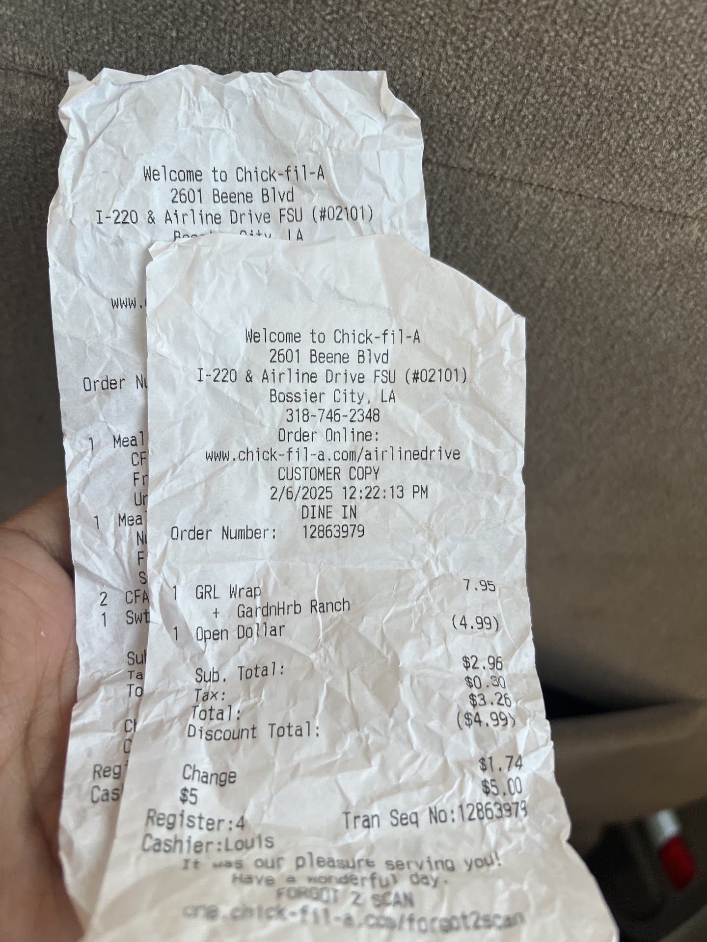 I actually called HQ and the reply from this location was literally a general "sorry, hope to see you again", cause they're to big to fail and not what Chick Fil A used to be. I'll never go to to this location, or really any Chick Fil A again, I can't trust their quality any longer, and $10 dollars is a lot these days. Sorry, Bossier City location ruined my decades as a...