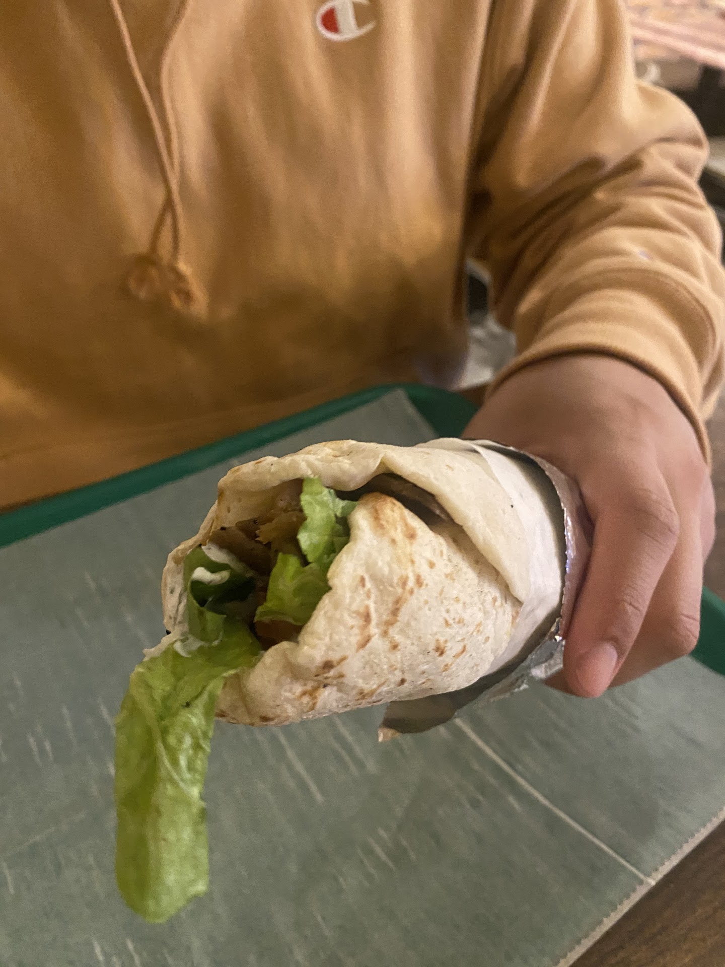 My friend had the gyro wrap. He said it was really good, but a little bit on the dry side. “A solid 8.” What would make it better? More of the spread (and maybe some of the whipped garlic on the side) so that it’d be less dry.