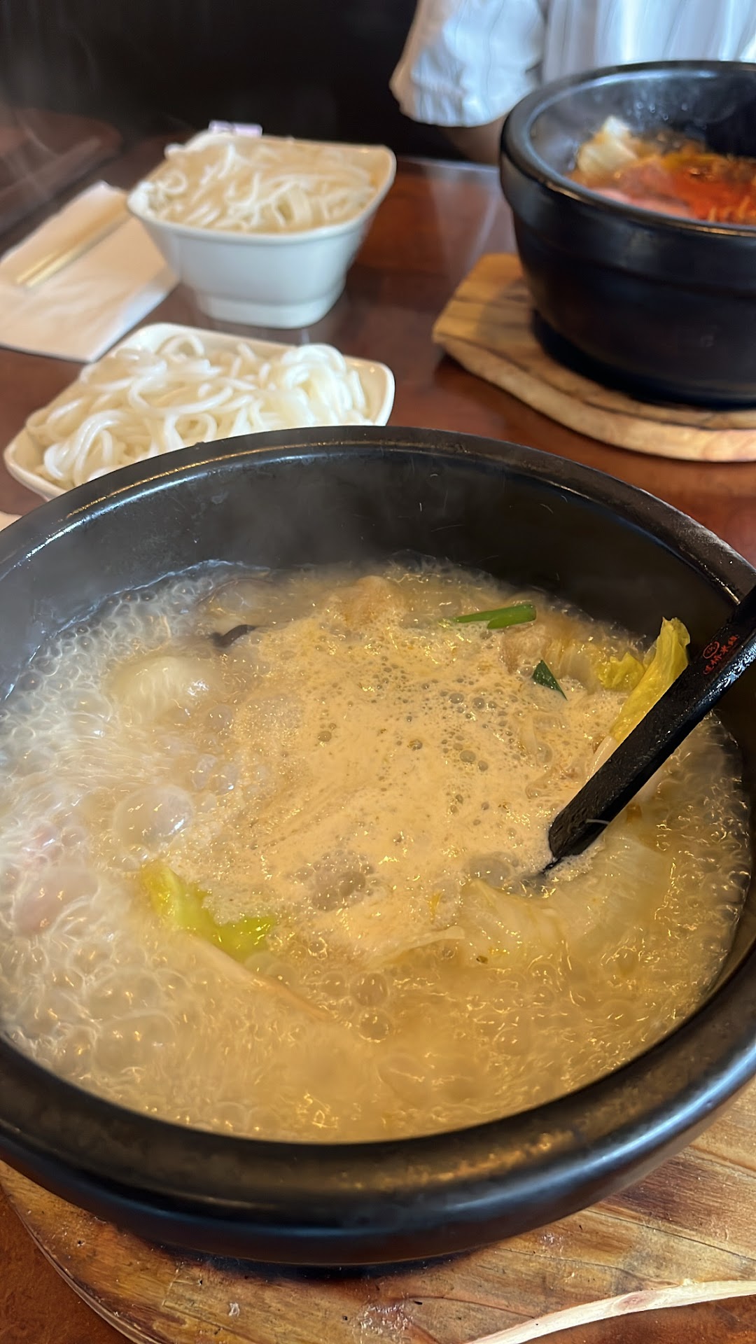 The soup comes out boiling hot in a stone bowl, and then you add your noodles at the table. Aside from the fun aspect, this means that even if you eat slowly, your meal stays nice and hot the whole time.