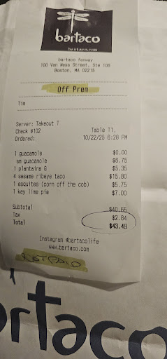 Since this past summer, I had been wanting to eat at #BarTaco. One afternoon, I entered #BatTaco, and excitedly placed! As I held my mobile up to pay, the cashier told me, "We don't have Apple pay." WONK, WOOOOOOONK! Last night, I perused #BarTaco's menu online and salivated over the items I wanted to try. This evening, I decided today would be the day I was going finally feast on food from #BarTaco! I called my take away order in at 18:28, and brought a different form of payment with me. Upon walking through #BarTaco's door, gracious staff directed me to the pick-up area. Two male staff and one female staff provided me with attentive and courteous service. Impressed, I gladly included a 5.00$ tip to the cost of my take away order. I told the female staff about my first try at purchasing food at #BarTaco, but they did not have phone pay. She exclaimed, "Oh, today is the first day we have phone pay!" She welcomed me, thanked me for ordering food, and gave me a few free taco wooden-like tokens. I expressed my gratitude, and thanked everyone for their assistance with my order. Confidently, I departed #BarTaco thinking that they had provided superb attention to detail service to my order. So assured was I that I did not look into the bag and check my order before leaving like I always do for take away. After arriving home and getting settled, I waited with bated breath opening the #BarTaco bag to serve and feast on the food I had ordered. WONK, WOOOOOOONK!!! My order of plantains was missing. Greatly disappointed and reluctantly, I got dressed and returned to #BarTaco. For the manager to think that removing the plantains charge from my bill and giving me free chips and two free taco tokens were adequate compensation for the visceral disappointment caused by #BarTaco, the disruptive inconvenience of having to return to retrieve my missing plantains, the fact that I placed my order at 18:28 and now it was 19:38 when I returned home a second time, and now my tacos and corn were cold and my guacamole and key lime pie were room temperature are an egregious missed opportunity to gain a loyal patron and everyone I know to #BarTaco! #BarTaco's abject service ruined my first impressions of #BarTaco, and spoiled the taste...