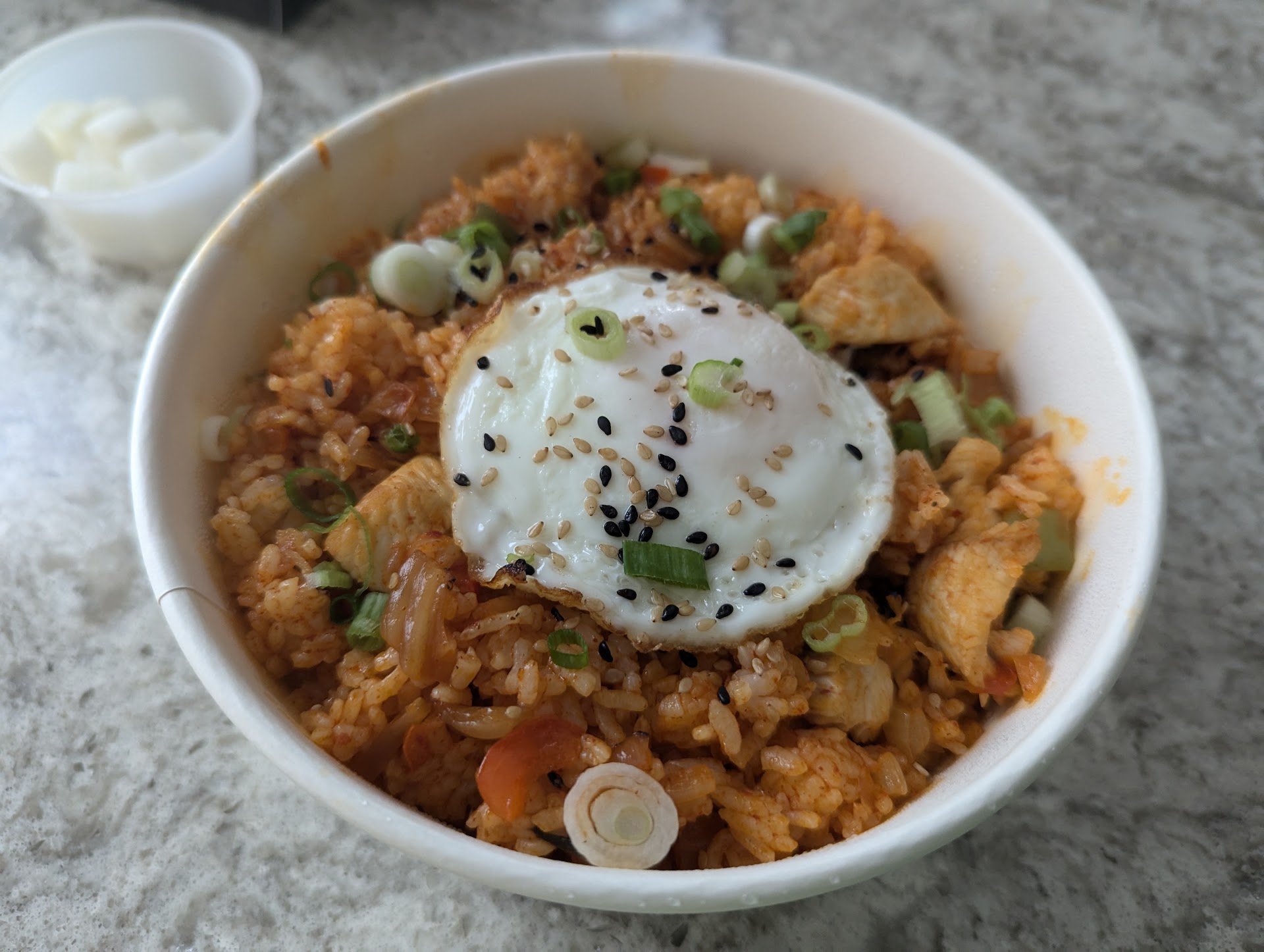 We also ordered the Chicken Kimchi Fried Rice, which was a bit underwhelming. The kimchi flavor didn't come through as much as I'd hoped, and the chicken was slightly overcooked.