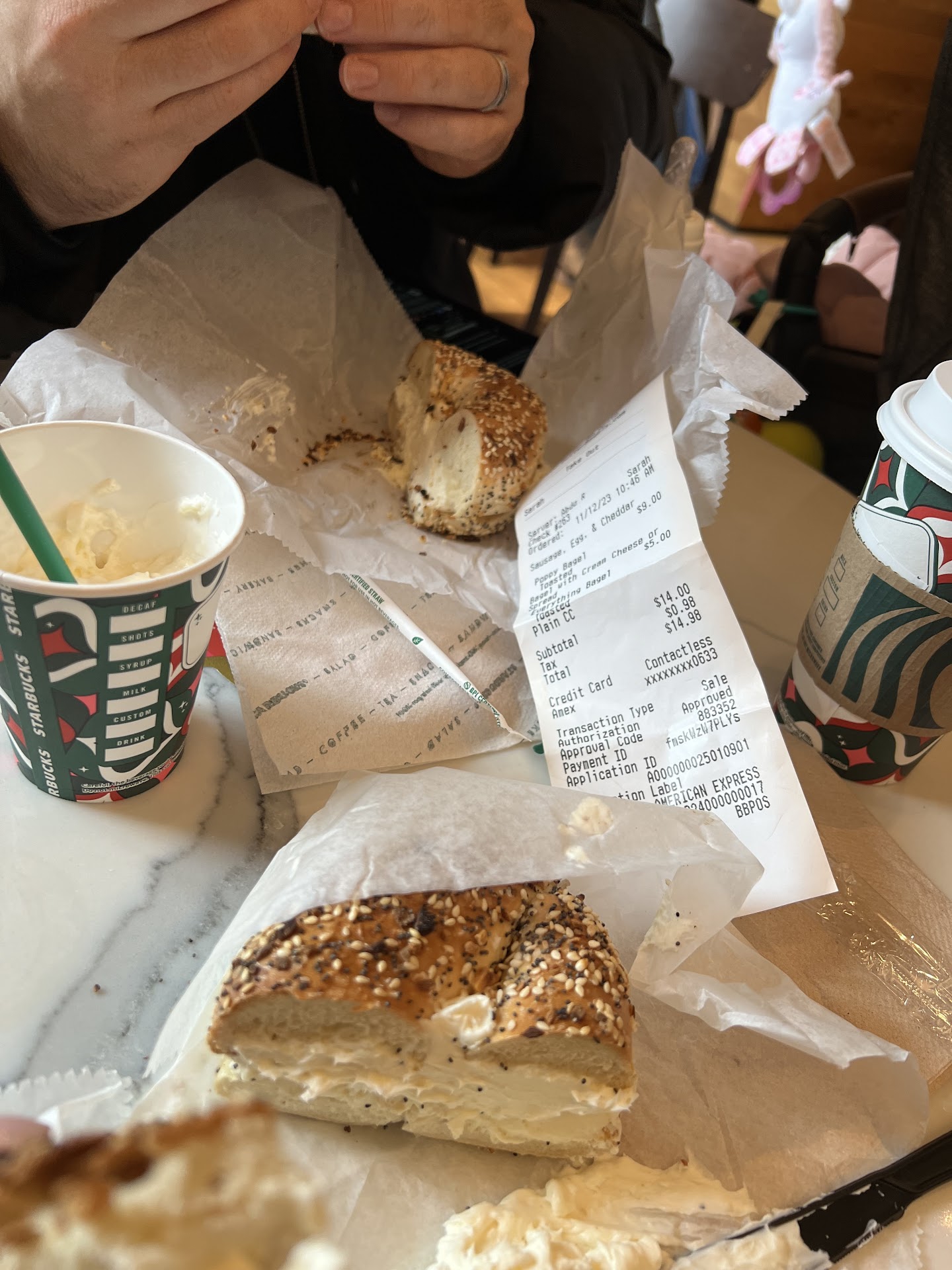 It’s a Saturday morning and I’m craving a bagel, and I could get this just a few steps from my door, but I’m not going to. The bagels are decent, but they're nothing out of this world and they're not NY bagels. The cream cheese is way too salty and there's way too much of it. It's almost $5 for a bagel with cream cheese, and they don't even know how to toast a bagel. Toasted means it should have some semblance of a golden color, not just feel kind of warm to the touch. And all you have to do to get a slight golden color is turn down the speed on the toaster (that every college cafeteria has and probably half the population knows generally how to use).