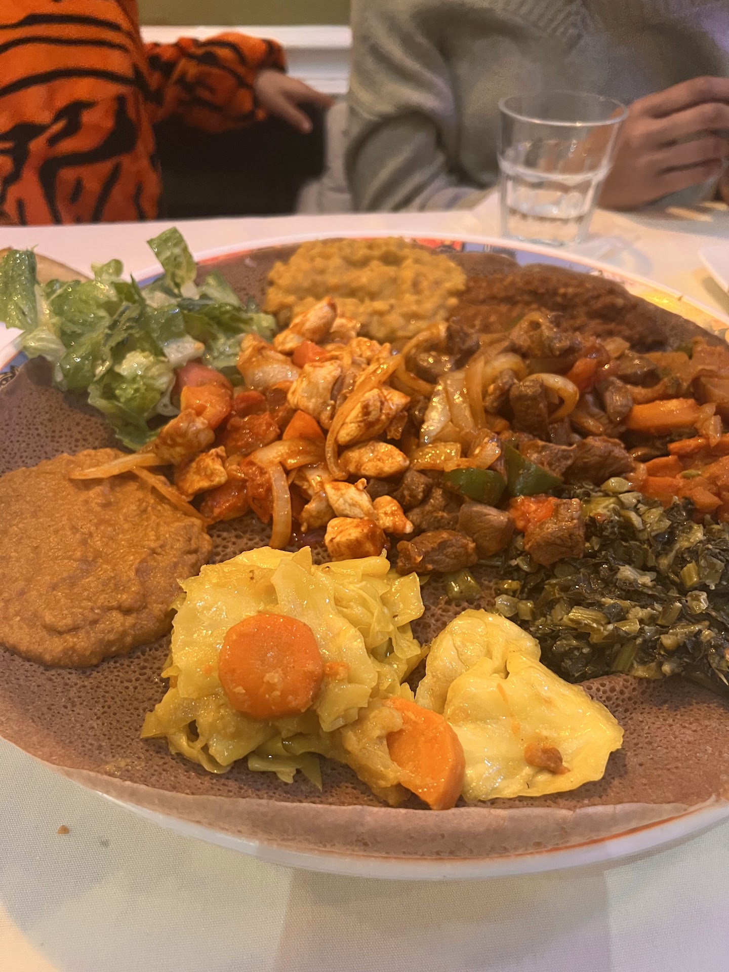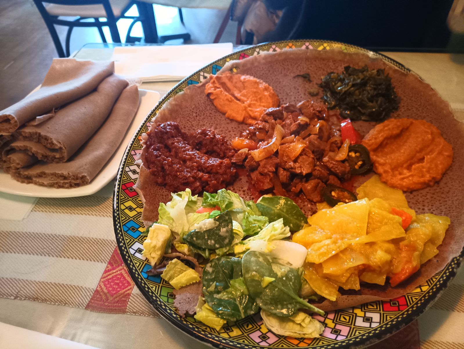 Went to try Ethiopian food for the first time per my wife's request. We were seated immediately and the atmosphere, although a bit dated, was very nice. It made me feel, as someone who knows very little about Ethiopia and even less about their food, welcome to a little slice of Ethiopia and it's history, thousands of miles away from Ethiopia.