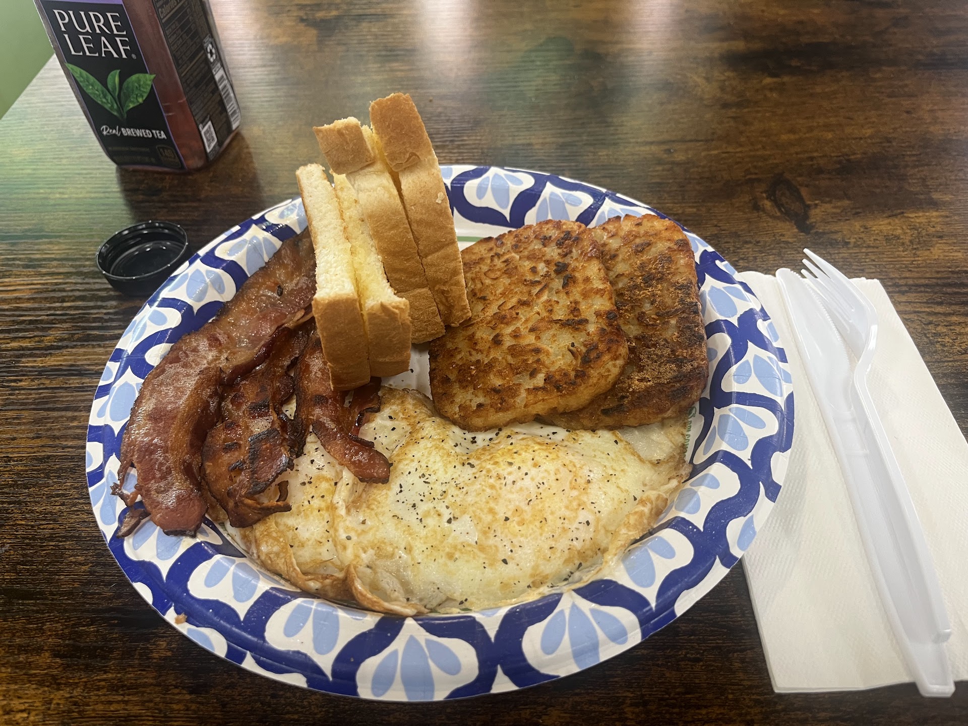 I don’t know what these other reviewers are talking about. I got their general breakfast plate, which included four limp strips of bacon, eggs (which were good), two “hash brown” things which felt like straight from McDonalds, and four pieces of pre-buttered white toast (was not given an option for bread). I would not say it was bad, but I would call the food aggressively mediocre.