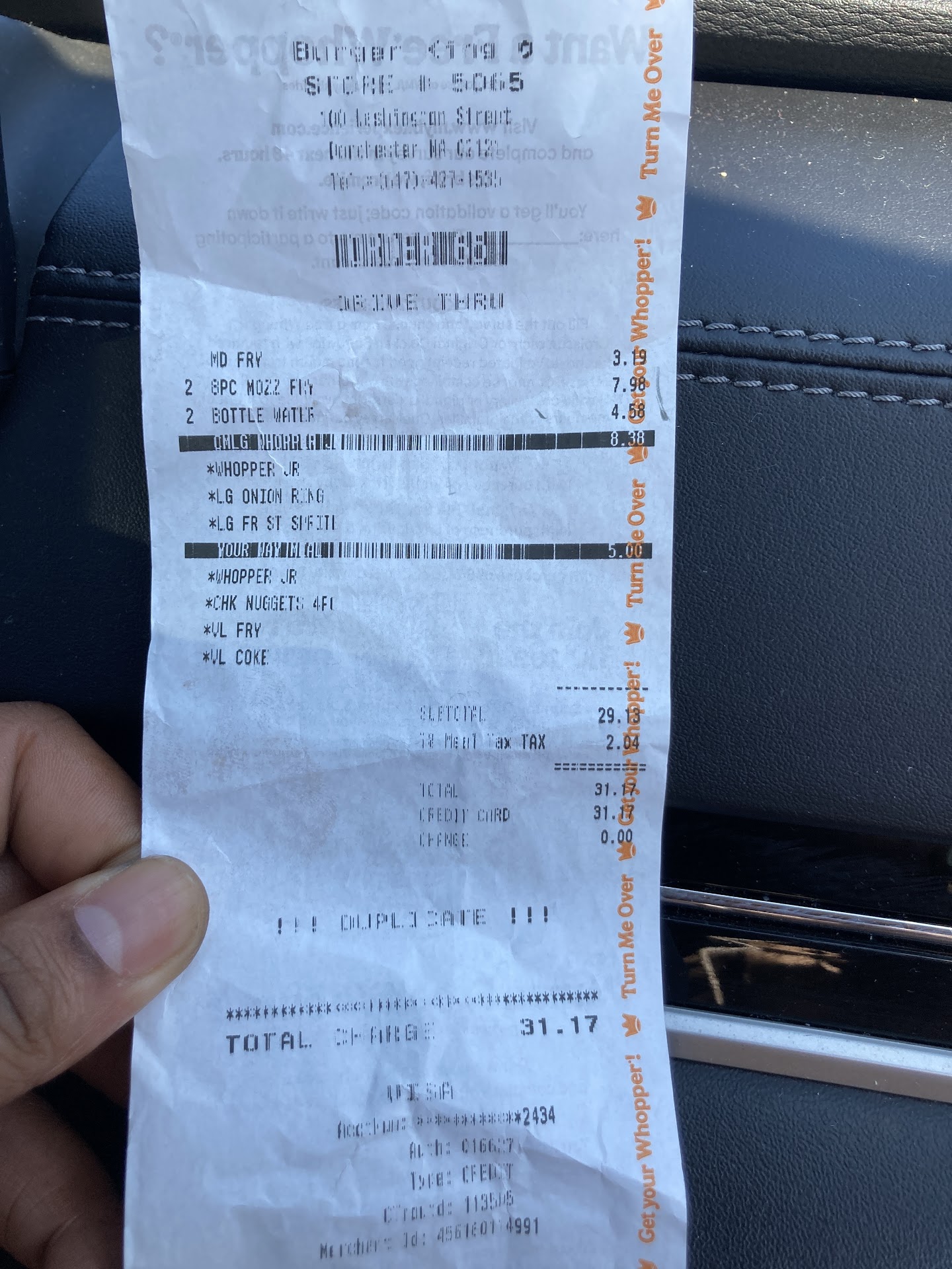 Awful, Awful, Awful today! I've eaten from here before in the service is usually good in the food comes out good too. We ordered through the drive through which we usually don't the girl could barely understand us I could barely understand her but I know I ordered a Whopper Jr meal with cheese no onions and no pickles and a fanta frozen. The person taking my order said that's it okay $6.30 next window. We all yelled "no tha not all we want. Then I ordered a #8 with regular coke for the drink. Then I ordered mocha iced coffee with extra cream no sugar, the girl said it comes pre-made I said ok please add extra cream. We saw no order details, she gave us a price of $14.95 and told us next window. We paid and drove to pick up window and was checking our food then asked for napkins. We got the coffee (not light like I asked, I mean they could've given me take out creamers to add myself) and the fanta frozen. We waited for the regular coke when they just stared at us like why are you still here? I said we're waiting on the coke the woman at pick up said what size I said whatever size comes with the meal. She said you ordered the iced coffee with the meal I said no, I ordered a #8 meal with a regular coke. She said ok $2.28, I said for what? She said the coke I asked for the manager she said she is the manager. I said what does the iced coffee cost she said $1.79 and I told her I'll pay for that. The price wasn't that much different but it was principle though. I understand everyone wasn't born here and needs to work but don't put the person who understands and speaks the least amount of English at the drive...