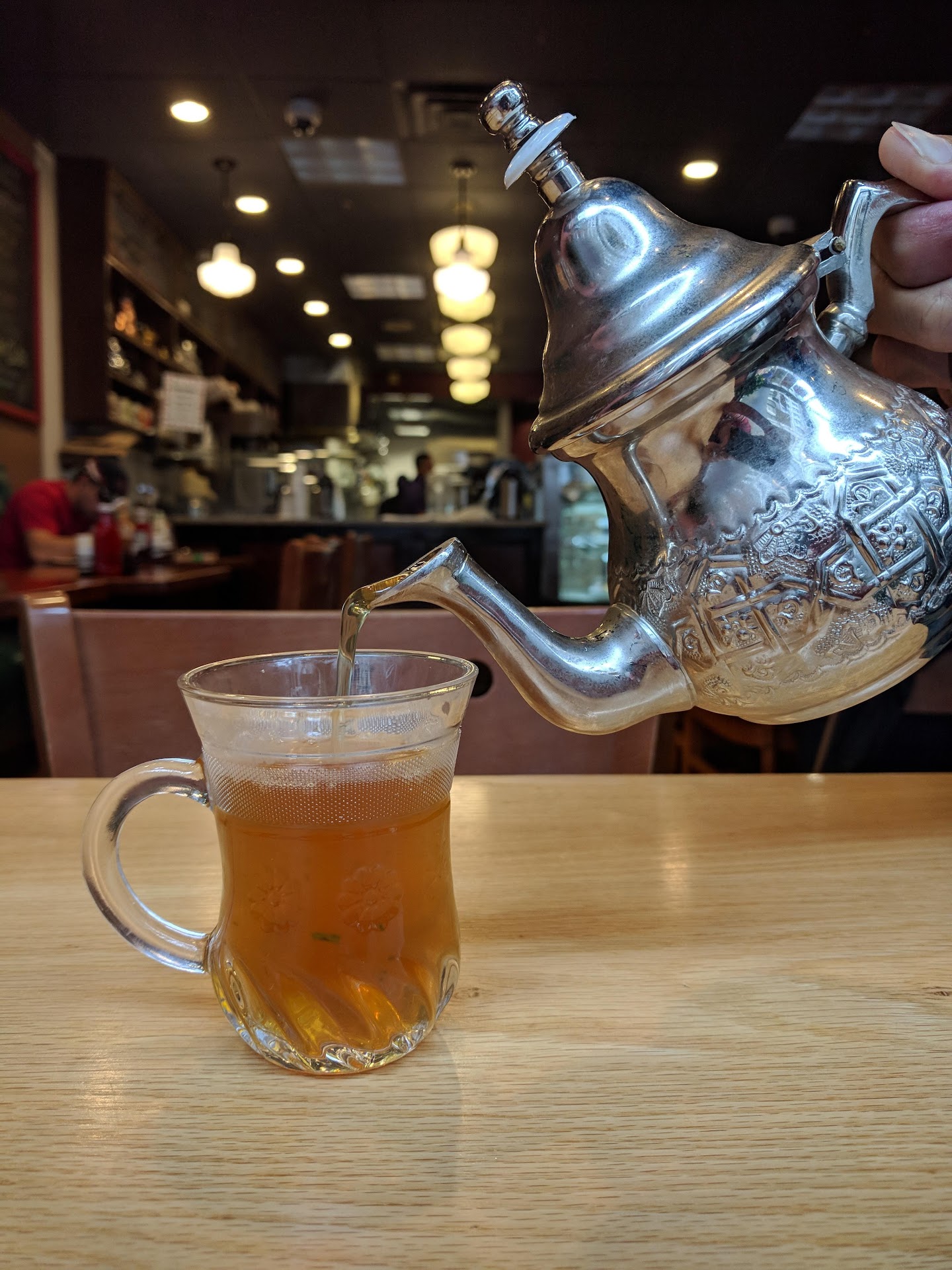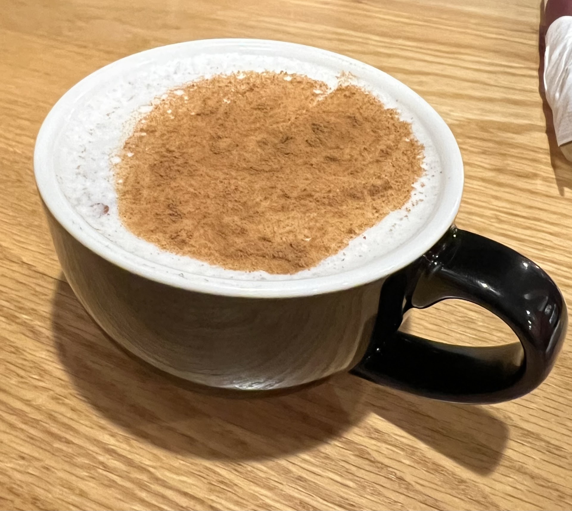 The Chai latte tasted like steamed milk with cinnamon sprinkled on top (pictured below). The Shakshouka was fried eggs on top of a red sauce with barely cooked veggies including bell peppers and red onions with some feta sprinkled on top. The French toast was mostly soft and chewy, not unpleasant but missing the crisp edge you would expect. We asked for a side of bacon that never came. I suspect that’s because the handheld ordering system is clunky and annoying for the servers to use.