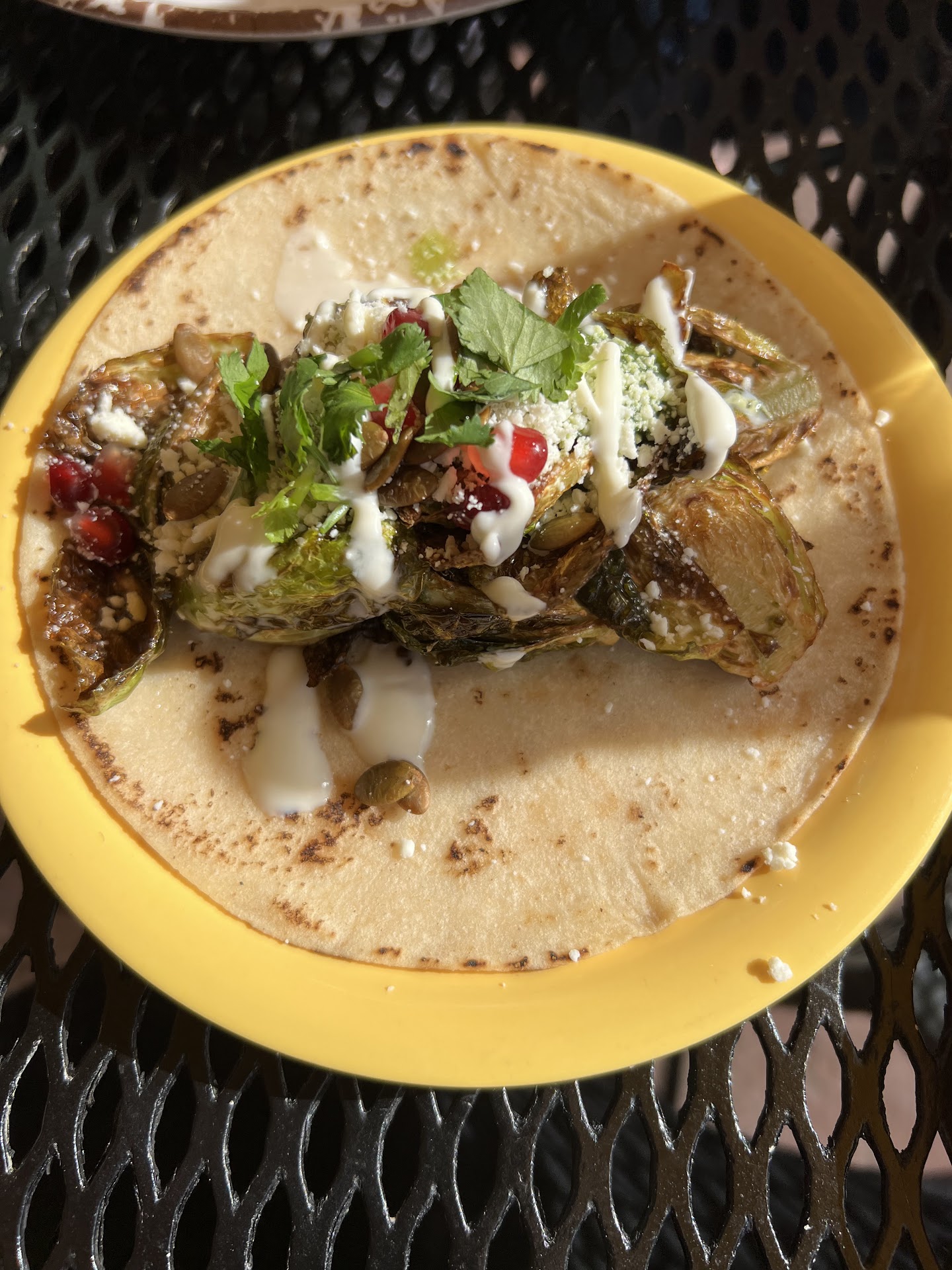 We ordered the Brussels sprouts taco, pescado taco, queso with carnitas and chips, and barbacoa quesadilla. Each dish was delicious and flavorful. The tacos were one per order and pricey. A carafe of water was placed on the table and the server poured our glasses from the carafe, leaving a small amount. When the carafe was empty, I went to a shop for several minutes. I came back to the table and after a while, I asked a server for a refill of the carafe. Afterwards, my friend said she had asked a server to refill the carafe when I was away from the table. The service was good otherwise. What I like is that different servers help out each table, not just one person.