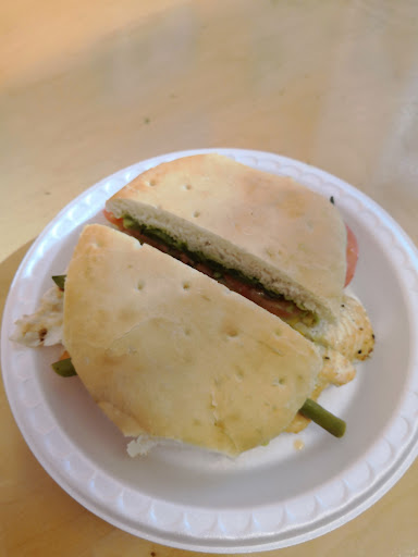 In addition, the lines are BIG esp during lunch times. I would suggest calling in first before picking up. Though to pick up your s/w you would need to squeeze your way through the existing lines. The sandwich is also over priced $7.75 for a small regular chicken version(taxes included) and it goes up to $10 for a BBQ Combo version(chicken & beef). This a sandwich you can really make at home with some bread, chicken and avocado spread along with some trader joes red pepper powder. NO CREDIT CARDS ACCEPTED. Still it is an OVERPRICED sandwich.