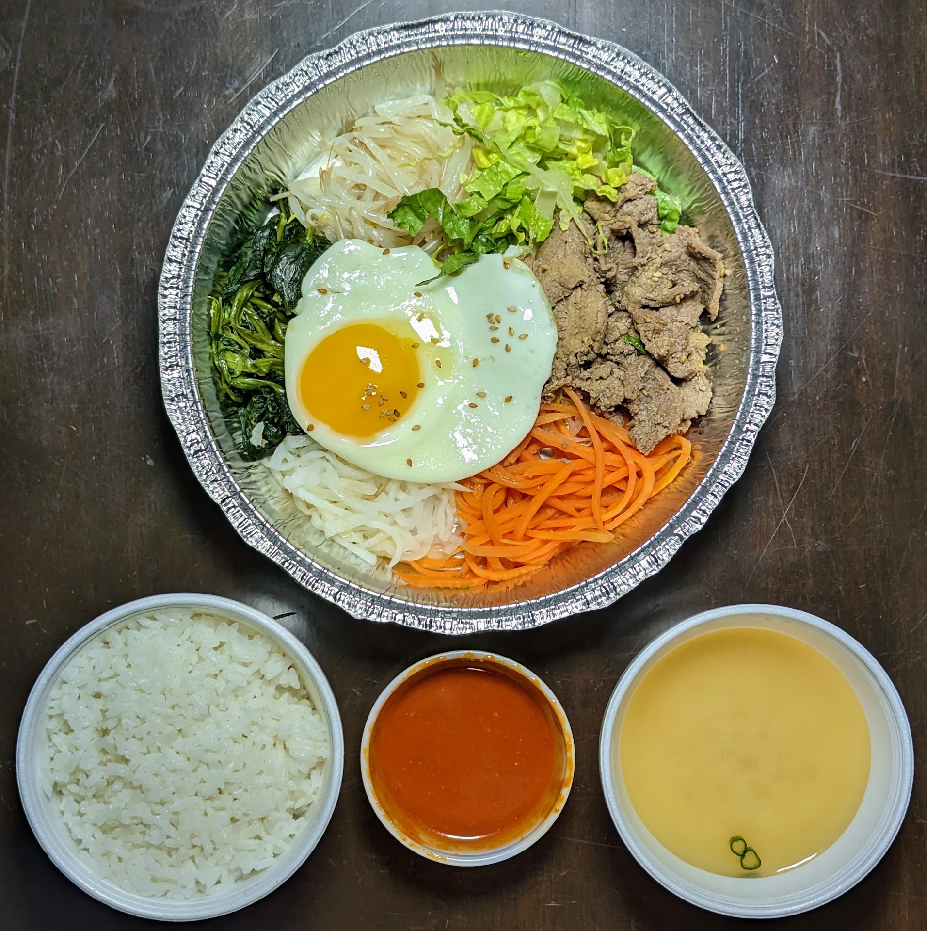 I ordered the bulgogi bibimbap on a regular Monday night and I would recommend avoiding this dish here. The bulgogi was dry and a bit plain. The fried egg was good well, with a runny yolk when I popped it. The sides were not great, not fresh, and it was a bit paltry (just a thin layer, you can see through to the bottom of the tray). The soybean sprouts and carrots were okay, not very seasoned. The radish was a little bitter, not sweet and sour as expected, so maybe it was going bad. The spinach also seemed a bit old. The inclusion of plain shredded lettuce was just very odd to me. I've never seen that as a Korean side dish before and frankly, it is so bland that I don't think it should have been served as a side vegetable. The bibimbap sauce was great, with just a low amount of heat (should be tolerable to most people), and a bit of sweetness. The miso soup was okay, with a couple of bits of tofu and scallion. Overall, the dish was extremely disappointing and unfortunately it the worst bibimbap I've ever eaten.