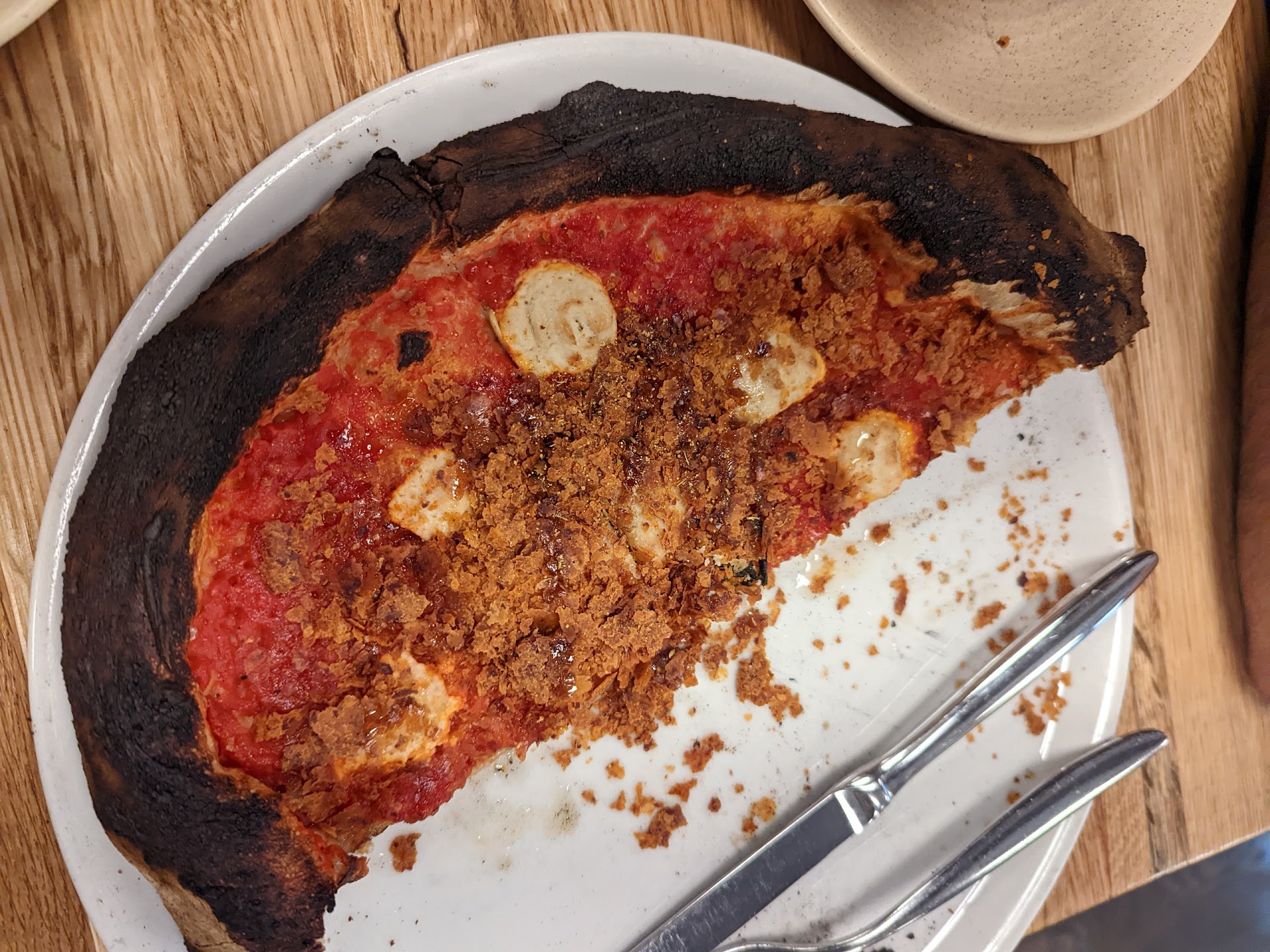 The Bad: -Of the three cocktails on the menu, they were out of all three. Out of the two desserts on the menu, only one was available. They were also out of a couple of the wines. None of this was shared with us before we ordered, so it got to be a bit frustrating. On a large menu, this would not be noteworthy, but their menu is extremely limited. Perhaps doing a daily or weekly menu would lead to less confusion. -The pepperoni pizza was SWEET. Not just a little sweet, but like creme brulee pizza sweet. With a vegan and vegetarian in the family, we have had many opportunities to have faux smoked meats, and this was probably the worst we had ever tasted. -Service was EXTREMELY slow. Not just Pandemic Slow, but neglectfully slow.