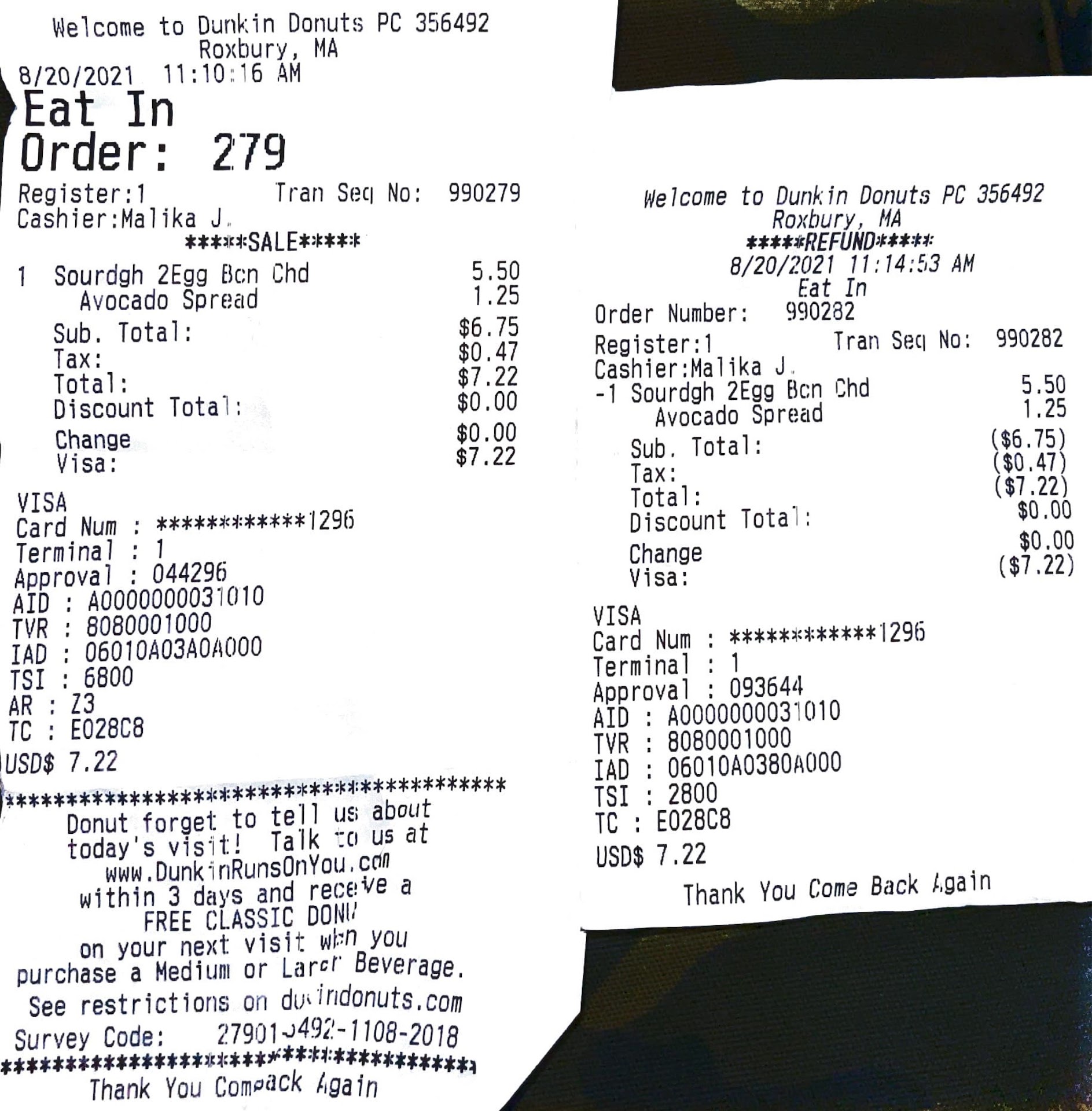 Kudos to Sosa. She is a SuperWoman. I placed my order in Dunkin at 3:23 on 8/21/2025, at 3:25. A rush of customers came in that did not stop until 4 p.m. Sosa was the only one working behind the counter the entire time. I sat down and enjoyed my order of food and beverage that Sosa prepared for me. I watched for the next 30 minutes, well Sosa prepared everyone's order that was in line, AND every mobile order that came over, without missing a beat. The rush ended at 4:00. A second employee came behind the counter at 4:01 from her break, with little to do, business had slowed. I had finished my meal and headed home. When I come back tomorrow, I hope Sosa, who I call... Dunkin's SuperWoman is there to...