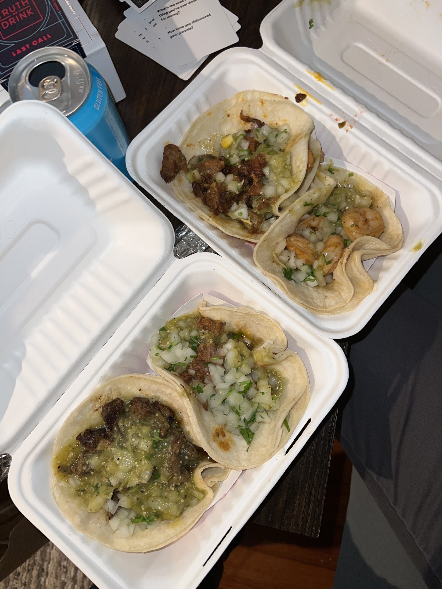 I couldn’t get the first taco an inch out of the container before losing half the shell and taco contents spilling everywhere in the container and on my table. Each taco proceeded the same way. You can bet your behind though that I ate every last bit. Everything was excellent - even the prosciutto thin soft shells that would’ve struggled with half the weight.