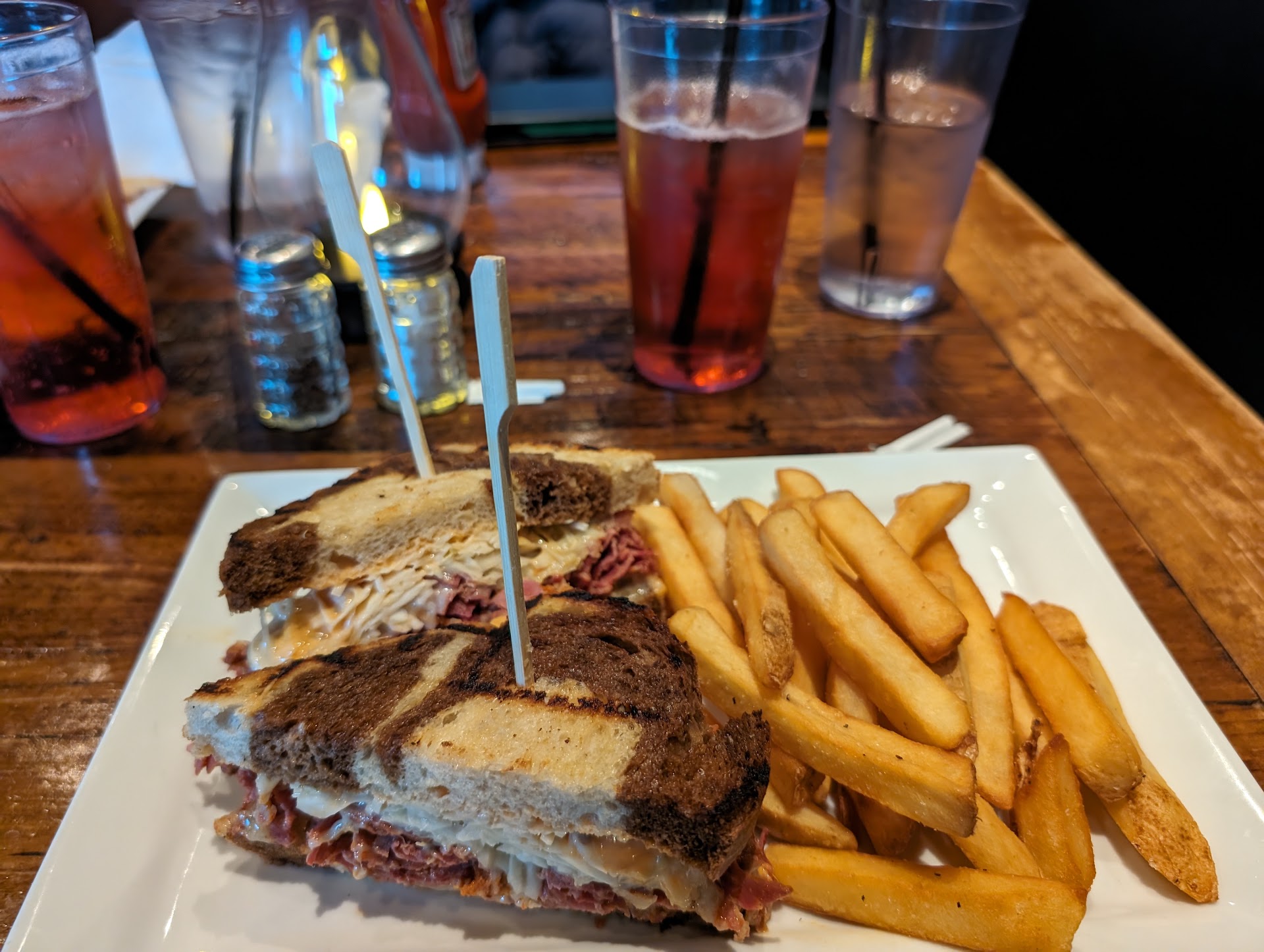 The sandwiches were a revelation. The BLT, adorned with avocado, offered a refreshing twist on a beloved classic. Meanwhile, the Reuben boasted the perfect balance of flavors and textures, leaving us craving more with every bite. Accompanied by golden, crispy steak fries, each component of our meal was executed flawlessly.