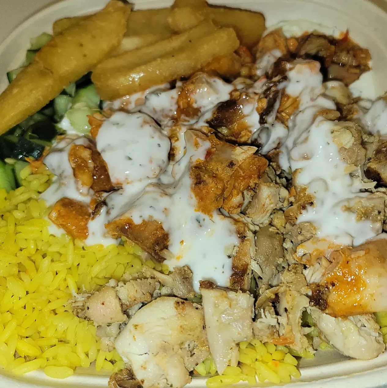 Food: A bowl with spicy and mild chicken, greek seasoned rice, french fries, cucumbers , red onions, tzatziki sauce and classic tahini sauce.