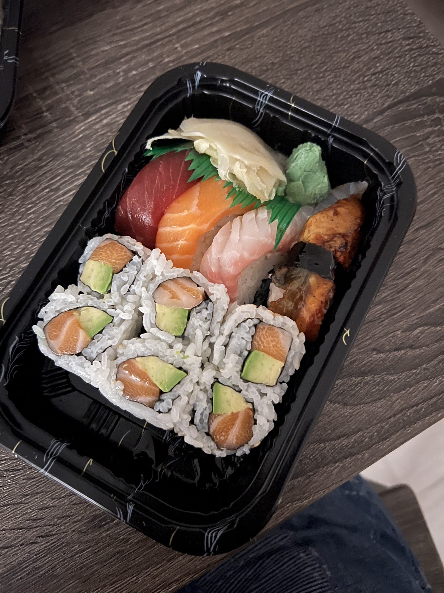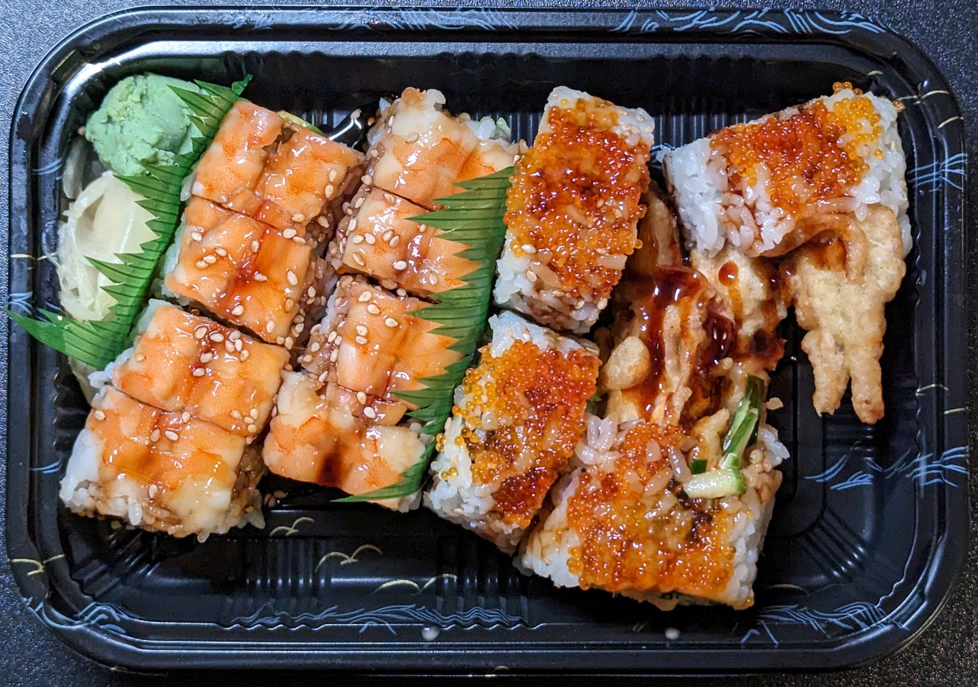 Decent sushi for a takeout place, considering the low prices. I tried the spider maki and the scorpion maki. The fried crab in the spider maki was not crispy at all, but the scorpion maki was very good. The ginger on the side was also good.