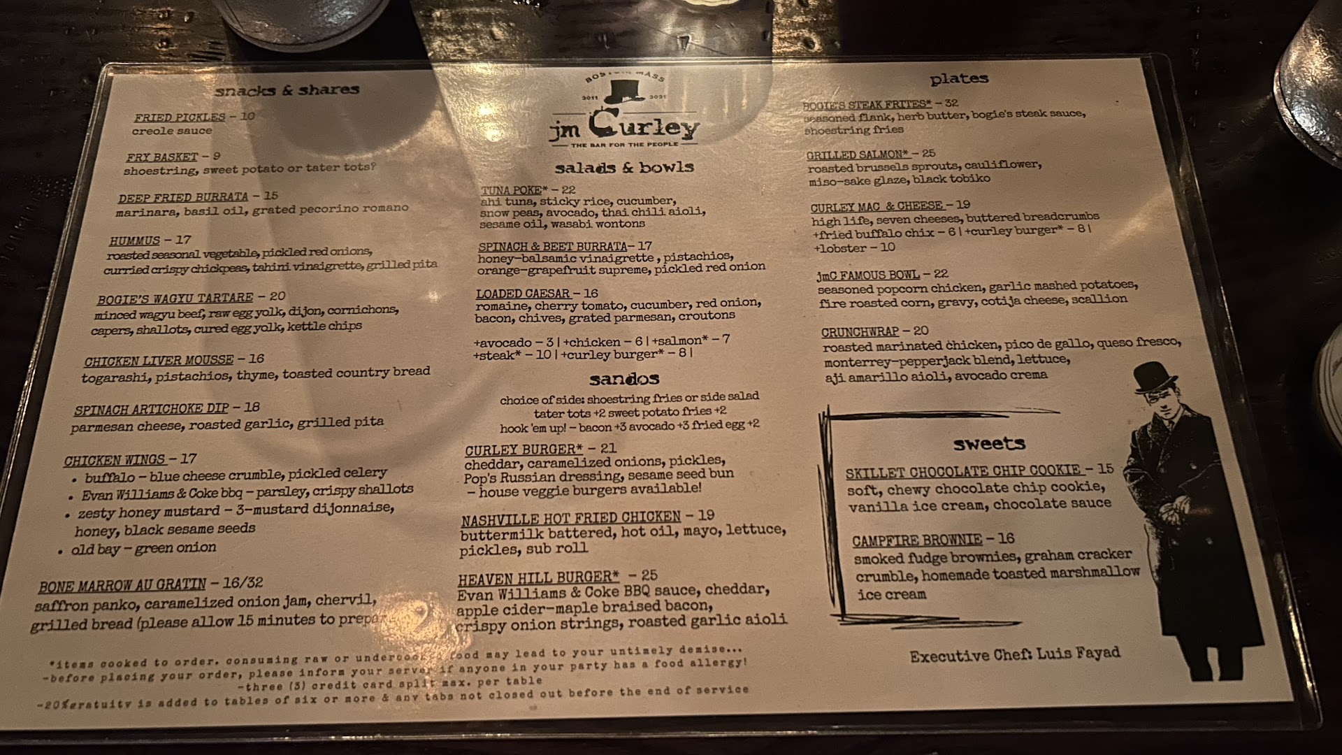 Read moreThis is the kind of place Downtown Crossing has been needing for decades. At lunch, it is a space for workers to get a quick sandwich plate or burger and maybe a surreptitious beer. Then jmCurley really comes alive after work -- it fills up instantly with people looking for an expertly made cocktail from an ever-evolving list of craft cocktails. The Temple Place G&T - made with bark powder - is my favorite variation on the classic in the entire city. Beer lovers aren't left hanging either. A handful of taps, mostly from local brewers, always offer a variety to suit most palates -- if not, their well selected bottle and can selection can definitely meet your needs. They also keep a chef's stock of 40s and tall boys for those days when that's what you really need, too. Food at dinner time includes a variety of tasty bar snacks. If the pretzels are on the menu, you need them. Same can be said for the deviled eggs. The entree list on the printed menu is very small, but it is supplemented by a list of 7 weekly specials that change (wait for it) weekly. Those specials always include a burger, a pb&j, a flavored popcorn (free!), as well as whatever chef Monsour and his team have on their minds that week. This ain't health food, folks, but it's hearty, tasty as all hell, and meant to share. In a city that has gone burger crazy, jm Curley offers 2 takes -- a smaller flat griddled patty, and a large fat grilled patty -- representing both of the major schools of burger thought. Both are excellent and you will likely gravitate to the style you ordinarily prefer. For "dessert" get a boozy concrete -- an ice cream based drink spiked with booze (and often fun accouterments like raisins soaked in so much rum they're damn near grapes again), and the skillet cornbread -- a variation on the new england version of the bread that has a pudding-like consistency perfect for dessert. After the work-crowd rush, Curleys is perfect for neighborhood denizens to stop in for dinner. Then the place explodes again as restaurant workers get off shifts across the city, as, at its core, this is an industry hangout. Any time after 10 you're likely to be rubbing elbows with the elite of the city's kitchens, just don't be a d-bag about it, as ownership is committed to keeping this place as a safe haven for those looking for an escape from nightmare customers. That said, if you're not in the industry, you are treated as if you were, and that is a wonderful feeling in a...