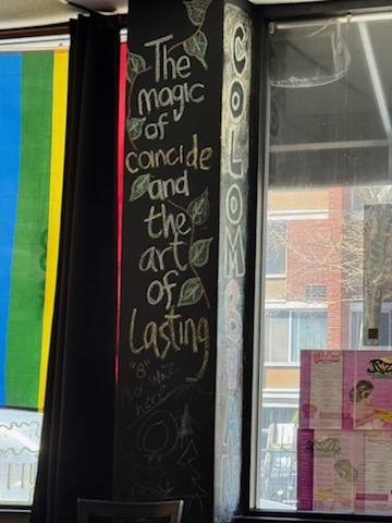 Lovely vibe. Wheelchair accessible nice long booths and tables. Bathroom door a little narrow from what I saw so just be mindful. Loved the chalkboard words of encouragement.