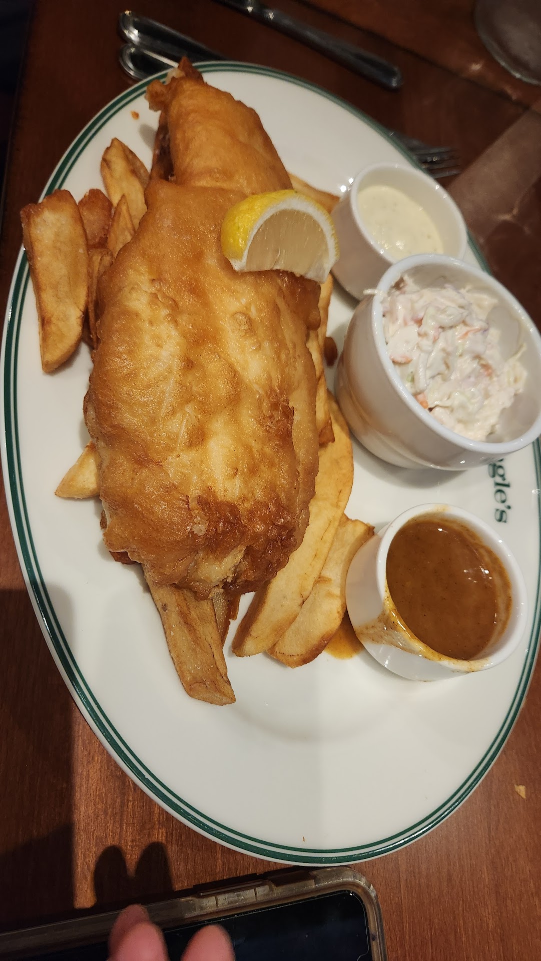 My friend had fish and chips and also shared the pig and blanket app, he loved all of his food.