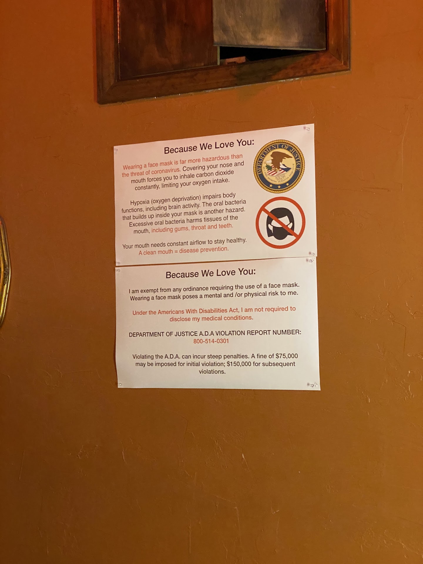 Read moreWent here for the first time for takeout. didn't realize until after ordering that the cashier was not wearing a mask and this sign was on the wall. (As a note, the Department of Justice has issued an alert about these posters as a fraudulent reference to the ADA and has not issued any such signs, nor endorse their content). I tried to have a conversation with the staff working front-of-house about the sign, saying how others wearing masks makes me feel safer when going out as someone with an underlying health condition. They were not receptive and were outright anti-science, stating that masks were more dangerous than coronavirus and referring to "germ theory" and the science around masks as an opinion. I left before receiving my order. No one in the kitchen was wearing a mask either.