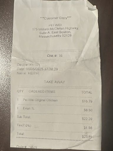 Read moreWhat a ripoff! I get being captive at any airport is expensive, but look at what I got for $15.79. Roughly $14 in rice, $1 in veggies and 79 cents in chicken. This was more like rice was the entree and the rest of the dish was the side. Before I walked away with this dish I asked the counter lady if this is for real and she said "it is what it is". @peiwei. Do better! At least what I did eat was consistent with a typical Pei Wei experience. Find another option at the Boston...