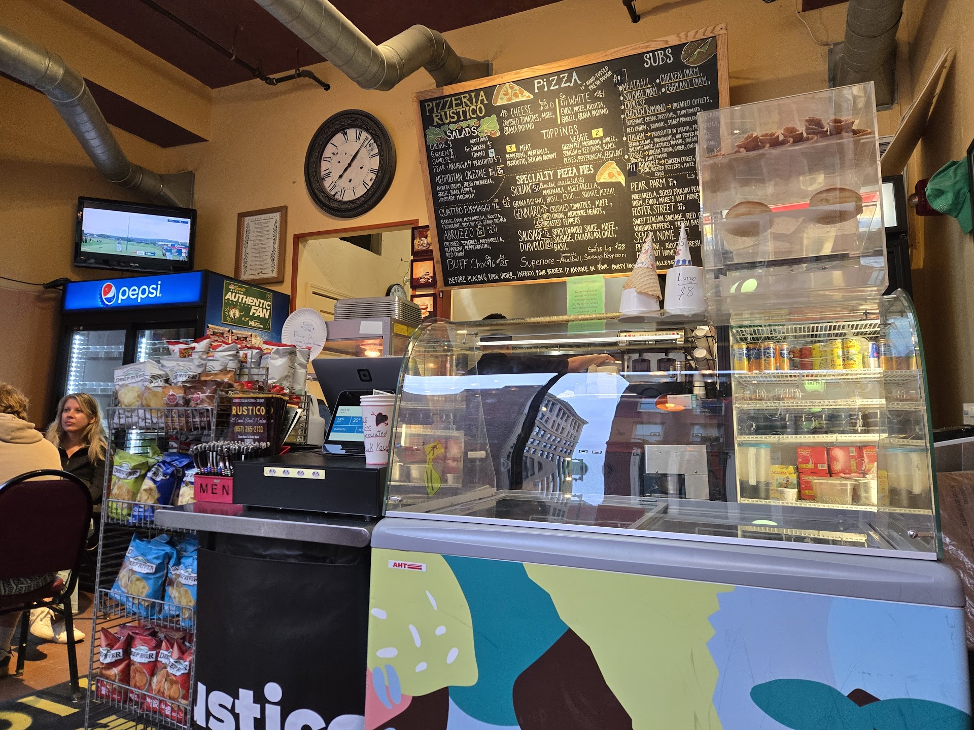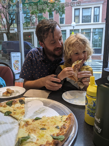Family of three driving from Montreal to Cape Cod for a three night four day mini vacation. On the way we punched in pizza in Boston on Google reviews. Rustico came up with a great rating so we stopped by. We were happily greeted by Evan and we asked what he would recommend for three hungry people. He said he knew exactly what we'd enjoy. We sat down and experienced superb tasty pizza 🍕 with the perfect crisp, flavour, and size. The reviews we had read were spot on and we recommend this small pizza store wholeheartedly. Evan's colleague Elaine was making the dough behind the scene with amore. The food is delicious. The place is small with only a couple of tables so it's not a place that sits comfortably but it's more for stopping in, ordering a slice or two, and enjoying the company of two smiling, happy, and friendly people. Loved the whole experience. Thank you Evan and Elaine....Bravo. P.S. there was a Boston Red Sox baseball cap on top of a wall unit and I asked if it was for sale and Evan told me to just take it but I left an amount on the cash register. What a charitable soul he is. Way to go guys!...