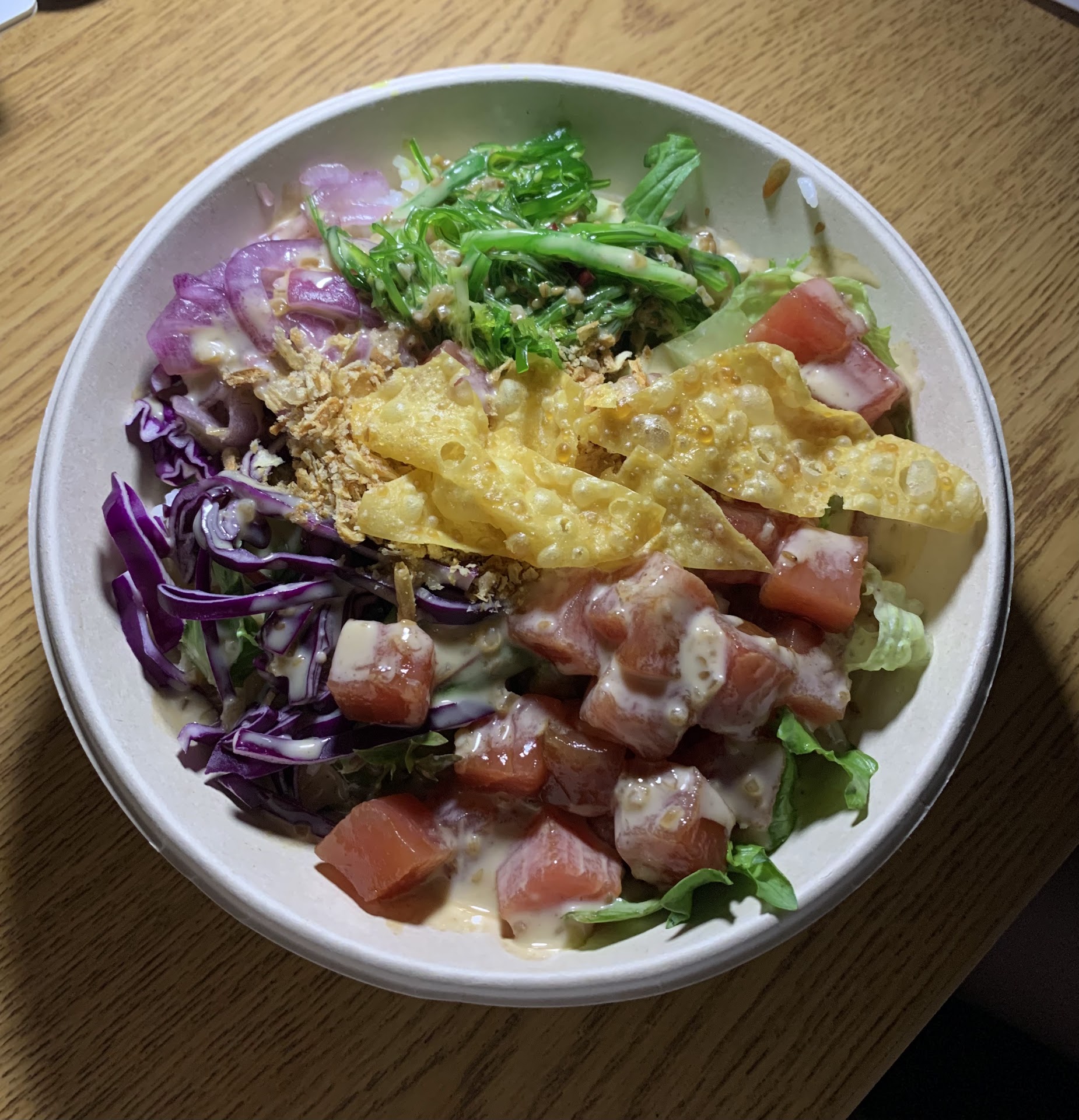 Whatever, I got my food. All my food for the day excluding some fruit I had later. 1st bowl- (tuna, edamame, corn, cabbage, cucumber, kimchi, sushi rice, sesame sauce) tasted fine until I bit into some particulate at the end of my meal. What the heck is up with eggshell and rock salt, and all these weird items ending up in food? People stop eating food from other places while your cooking people or being gross and putting things into peoples food who did you no wrong just because you are having a bad day. Like what is the deal with the crazy lack of customer service? Anyway, the 2nd bowl (salmon, carrots, cucumber, kimchi, mango, edamame, tomatoes, brown rice, and spicy mayo,) and it made me feel like I was back in Hawaii for a second. It was soooo good. Apparently something happened and the staff got out of their feelings and one of them was nice and even helped me open my drink. SO - 1 okay and 1 very good, which is I am giving...