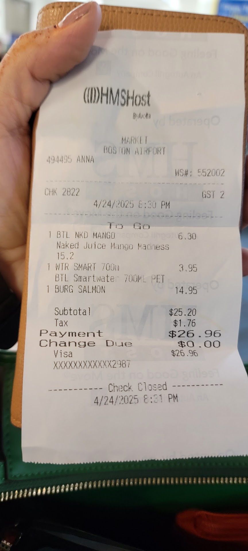 This doesn't even deserve a zero. Went to get food while waiting for a flight with a layover of 2 hrs. My daughter tried to grab a water bottle and the enclosed glass that had handles as if you slide to open the display. The glass that already had numerous cracks on all corners, as you can see in the pictures, fell on her left foot. The employee behind the counter took 3 minutes before coming around to help my daughter as I tried to take the glass door off her foot. The manager walks by cursing because she had to write an incident report. She didn't ask if my daughter was okay or even acknowledged anything. While my daughter started crying in tremendous pain. Finally, the same employee who tried to help asked if she wanted ice. Which we denied. Placed an order for a salmon burger and water bottle.. After the ordeal to have proof since the manager didn't even attempt to acknowledge anything while still standing in front of us talking in spanish, clearly through her body language, she was talking and cursing. I then went and asked the cashier if they had any tylenol, and she said she would ask the manager. Another missed opportunity to talk to us and ask if my daughter is okay. Cashier comes back and says they have no tylenol...the manager was literally less than 3 feet from us. I finally just went up to her and asked her if she was the manager without being rude or angry...I was met with aggression and disrespect..she yelled at me...and I asked her why are there cracks and all she kept saying was you don't lift it..well if it has handles anyone could get confused after 20 hr flight between 3 airports....nonetheless, I wasn't trying to even complain I was more worried /concerned the glass door would fall on Someone else. I was Utterly disgusted and disrespected on top of injury my daughter got at their establishment. I will be calling corporate....she is lucky I didn't cause a scene or curse her out. She wouldn't give me her name... Dominican woman who was manager on April 24, 2025, around 830ish pm. Bonus I ordered a salmon burger and they gave us a...