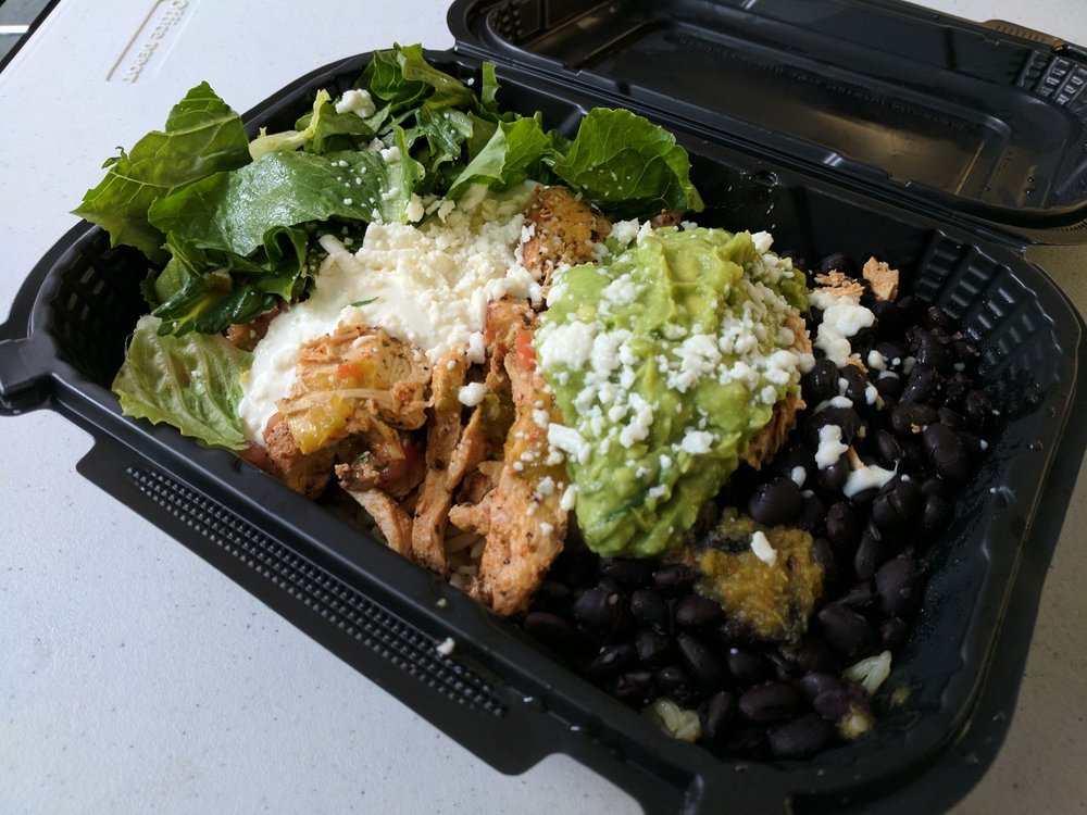 I tried the Chicken Bowl. Individually, each of the main components were tasty enough: black beans, rice, lettuce, pico de gallo, chicken, avocado. Would have been a bit better if these were pre-mixed for you. Everything tasted great, but nothing out of the immediate realm of ordinary. The chicken was moist enough, but a few pieces were dry. The black beans were soft enough, but some were a bit hard. Plenty of sour cream and tomatoes to make sure nothing was dry. Slightly spicy, but nowhere near overwhelming.