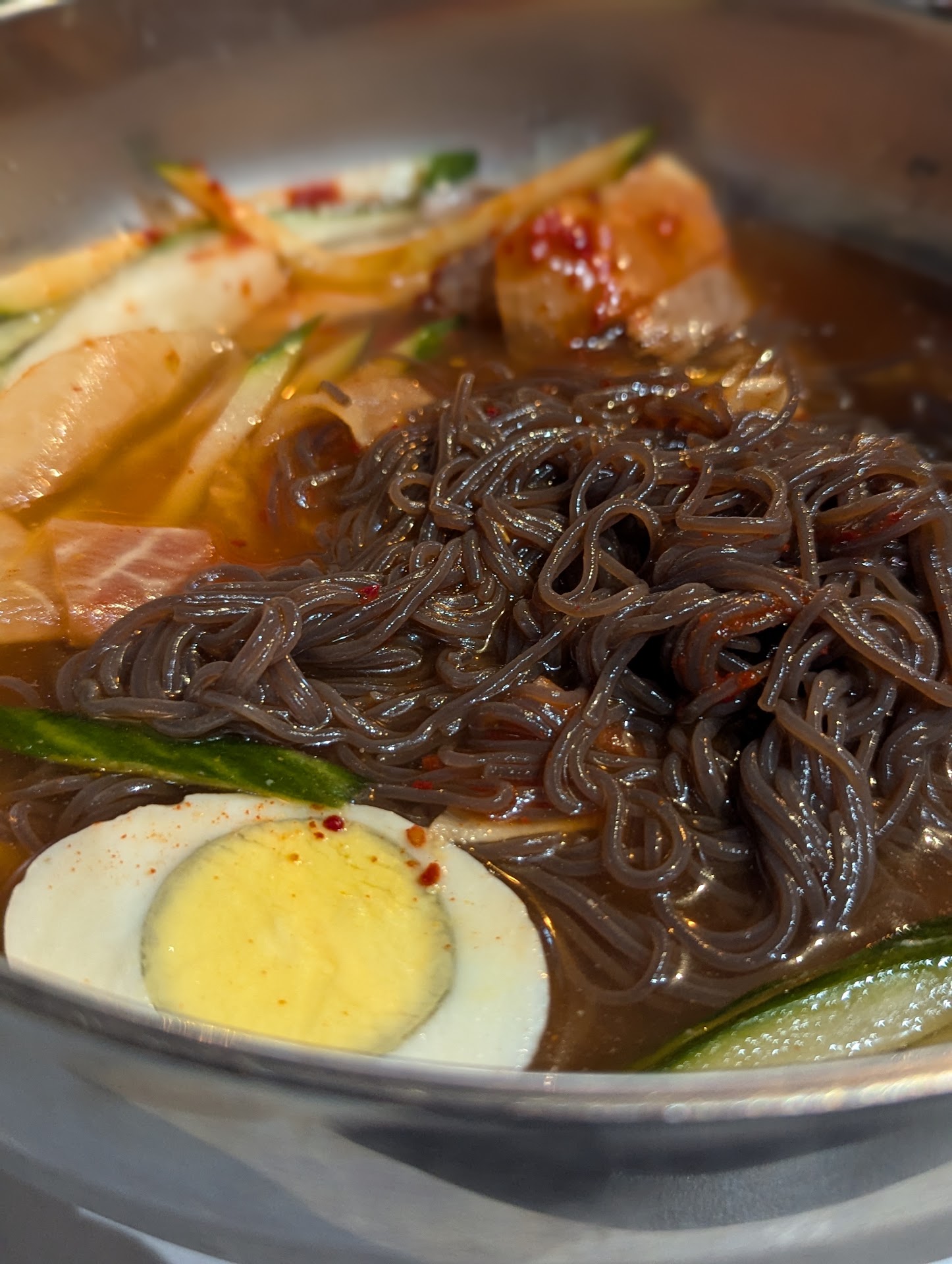 Read moreI had a hankering for Korean food while walking around today and decided to stop into this place on the way back to the hotel. The place looks more like a bar or one of those more expensive restaurants that Boston has all over the place, so it's easy to miss unlike other Korean restaurants where there are signs in Korean advertising the place. Initially, I was going to get their jjamppong since the menu clearly said it didn't have shrimp in it, but when I asked the server, he said it did so I opted not to, not wanting to deal with an allergic reaction from the shrimp. So I tried their Naengmyeon noodles. Think of noodles in a broth. Now think of it in the opposite in terms of temperature. These noodles are served cold with a chilly broth. The broth itself was quite flavorful by itself, but after adding in the gochujang sauce and mixing it all up, that's when the flavors really started to pop. The banchan that comes with it are kimchi, bean sprouts, and potatoes covered in some kind of sauce that's reminiscent of potatoes in a stew of some kind. There are other Korean places that serve this dish, but don't have slices of Korean pears in them, but this one did. The noodles were springy and thin, vegetables and pears were crisp. The broth at the end was still cold, but there was a slight sweetness to it as well as a hint of spice but overall refreshing after a long day's walk in the heat. I highly recommend this dish if you need some food and something to cool you off after a...