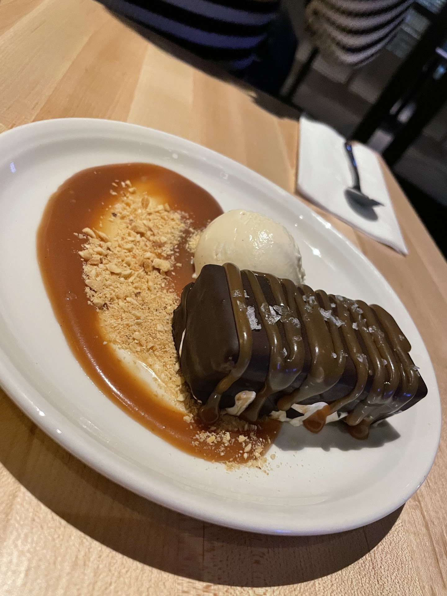 For dessert, we tried the Snickers bar, my only critique being its excessive sweetness, further accentuated by the sweet caramel sauce. It lacked a balancing element for the overpowering sweetness. Despite this, we thoroughly enjoyed it, recognizing the craftsmanship and love evident in its preparation.