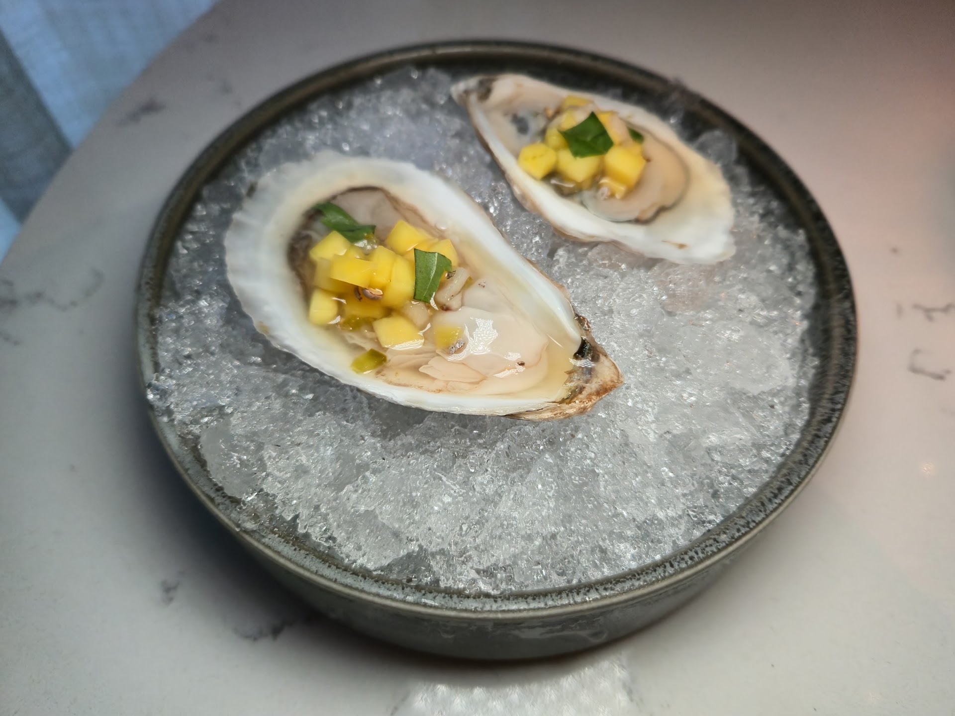 Compared to the oyster bar, the menu here felt uninspired. There were a few playful snacks designed to pair with cocktails and wine, like the parm-onion dip and oysters, but little in the way of creativity or inventive dishes. Still, my favorite from the small plates was the parm-onion dip with trout roe. The oysters, which came free with our martini (a happy hour special before 6:30?), were served with a ginger-apple mignonette, but its intense peppery aftertaste made it feel less refreshing. The roasted clam had an overwhelming ocean aroma, and the pancetta was so tough I initially thought Iâd bitten into a shell. The tripe was tender, but the chickpeas in the broth were undercooked, which threw off the texture.