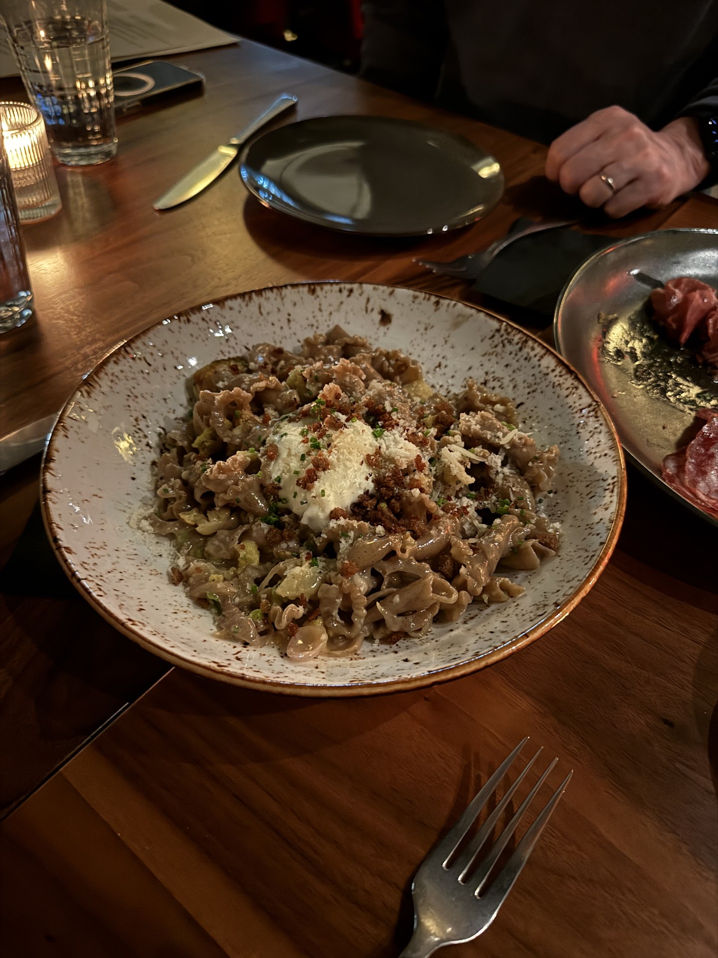 The entrĂ©es were better. Harker took particular pride in the lasagna, and it delivered. Arguably on par with the one at MIDA (my favorite in Boston). The Porchetta was another one of my favorites. Perfectly crispy skinânot too hard, but easy to bite through. The caramelized onion & apple (?) sauce and spicy harissa balanced the pork fat. The bucatini was solid, with a perfect al dente bite, though the diavolo sauce lacked intensityâa bit more reduction would have amped up the tanginess and heat.