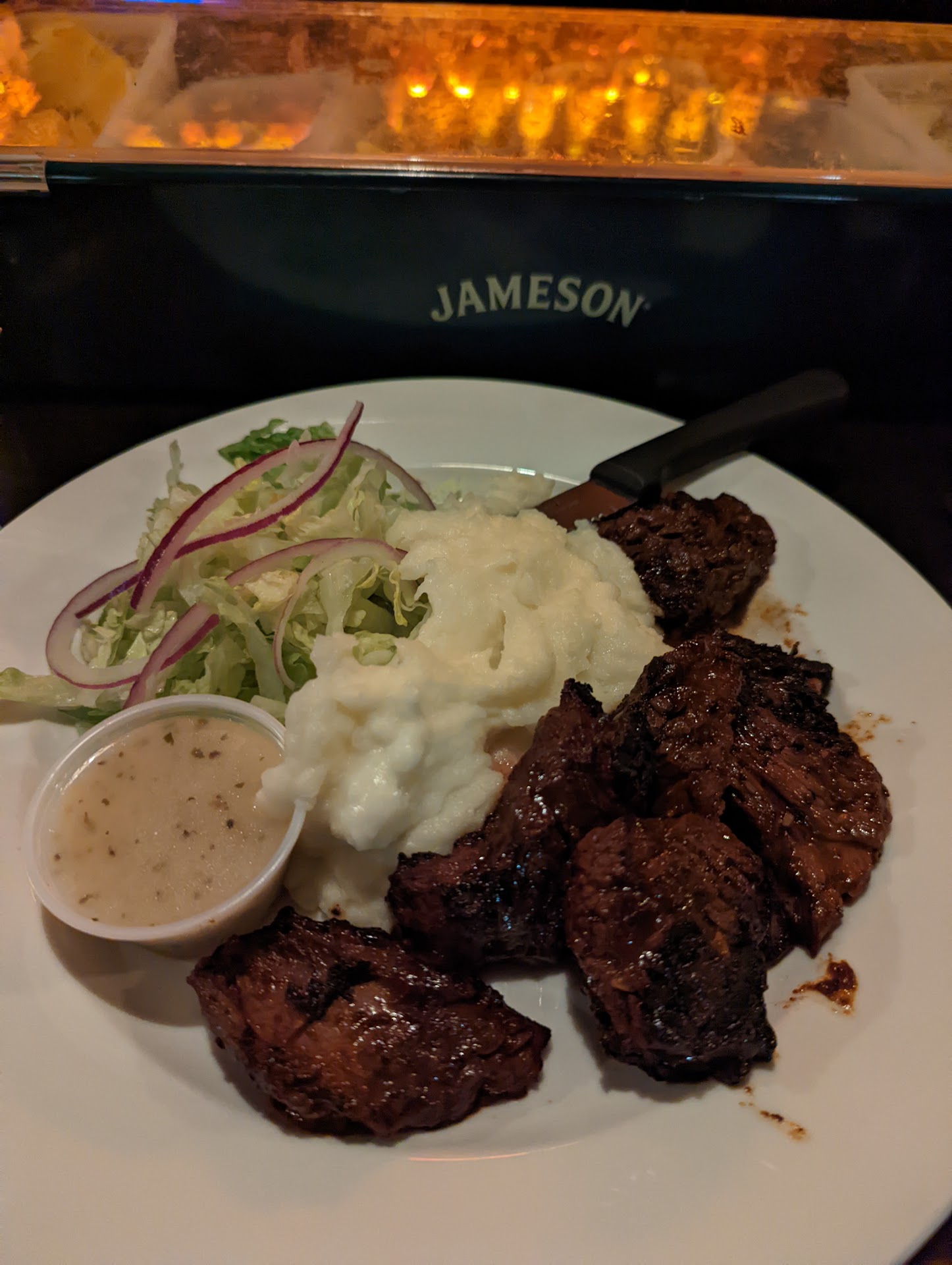 In terms of food, we were hungry and we were coming at last call. Our expectations of the food were low. Yet we were pleasantly surprised. I ordered the steak frites. When I took the first bite of the steak, it had the perfect char on the outside while maintaining a tender and juicy center. It came with a savory sauce that paired well with the potatoes. This was one of the best steaks I've ever had in my life. I wonder if it was sheer luck but Id love to come back and try it again.