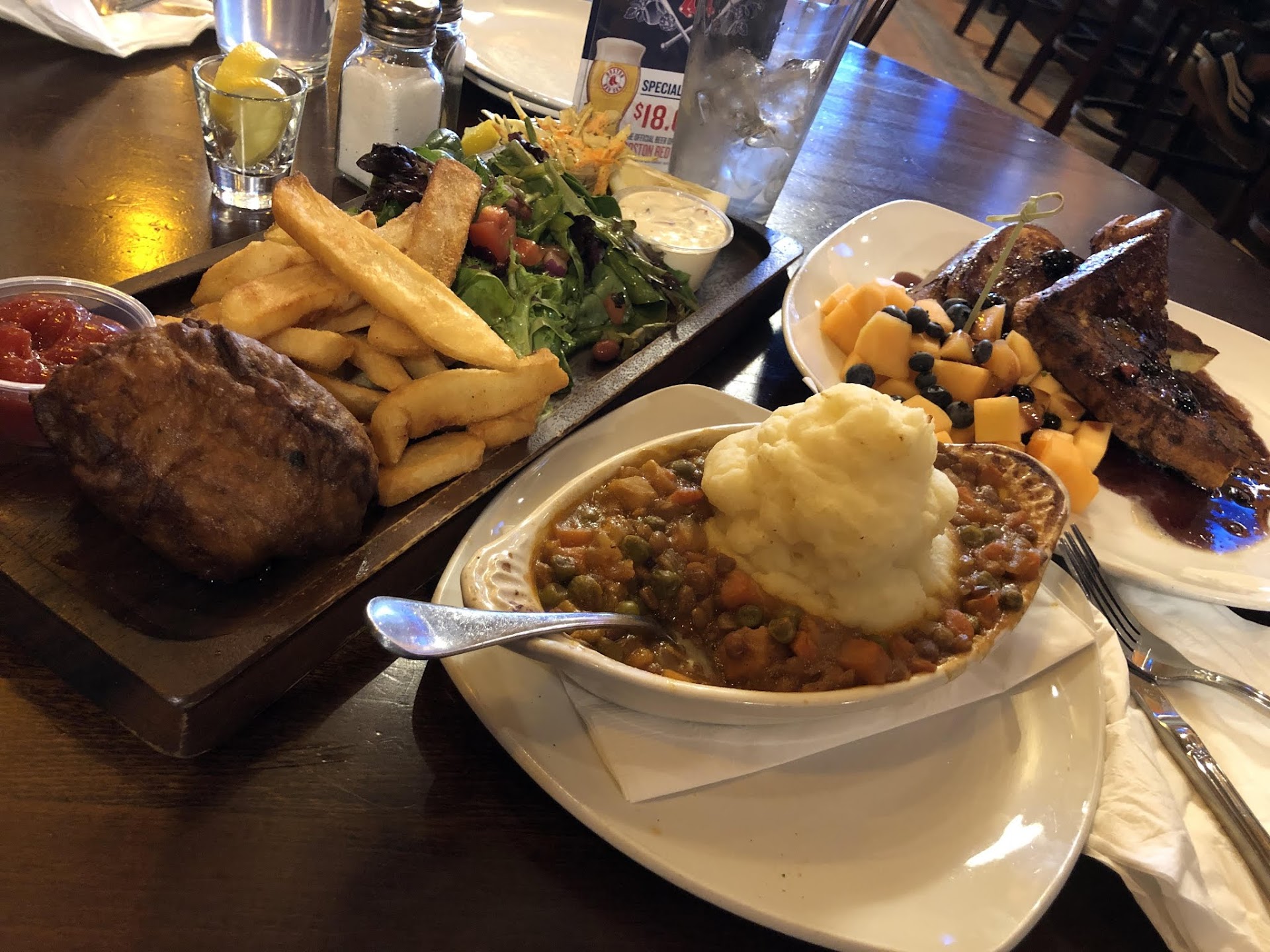 The food here is slightly above average, not great. We had the fish and chips (which came with a pretty small portion of fish but it was good nonetheless), the vegetarian shepherd's pie (spiced well but nothing special), and the Banana-Blueberry French toast (these were GOOD but then they were accompanied by cantaloupe, which is totally "filler fruit"). I would order the french toast again.