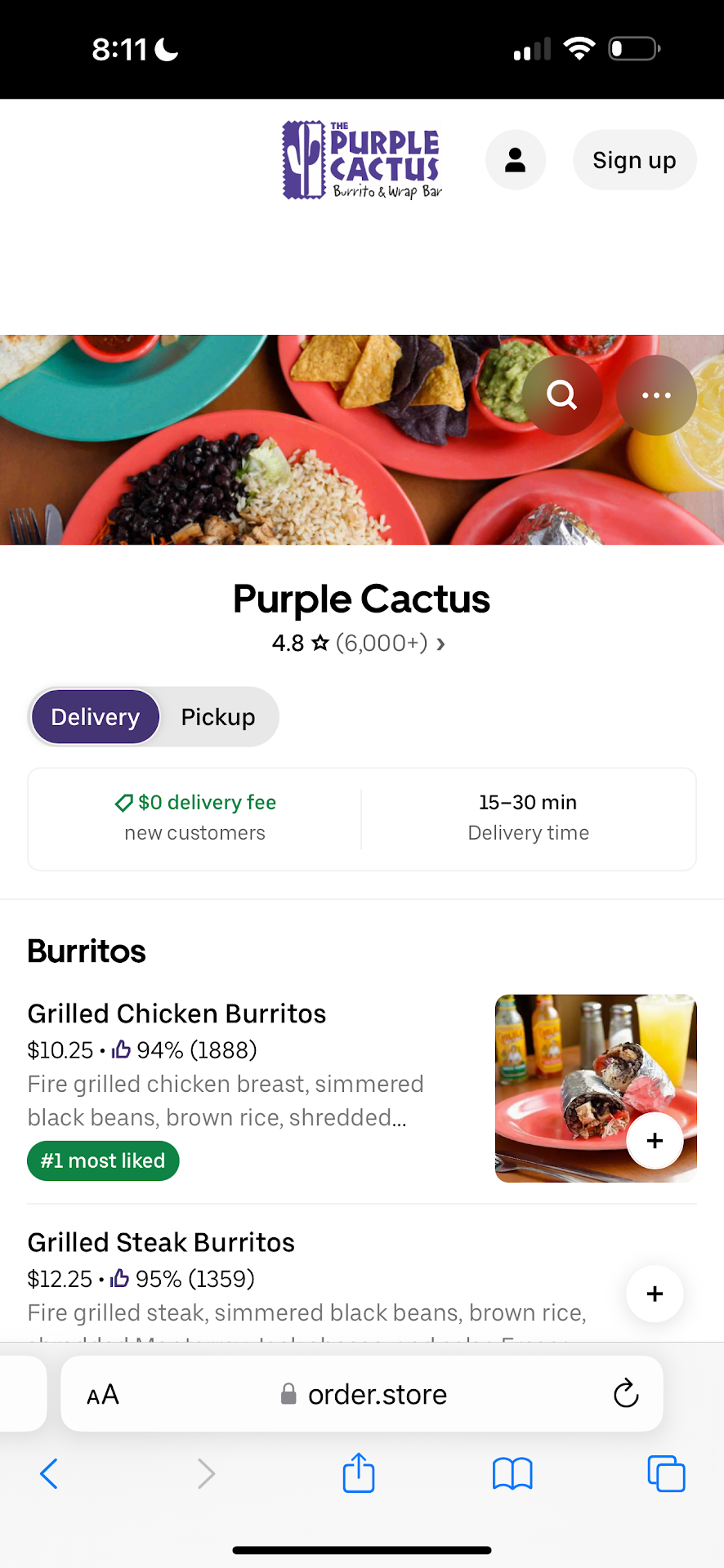EDIT: Finally got receipt from Uber Eats two whole hours after order was placed on Purple Cactus. Charged $5.50 for delivery fee (not free delivery so now I know not to confuse it with āno delivery feeā š«„) & $7+ for service fee + $8.60 in tip that I had no option to choose. $20 in fees for an order that was actually $38 including tax. Only got $5 promo that offset the delivery fee but for fifty cents. And food was ok but definitely not worth $58. If youāre going to order pick it up, but Iām so turned off that Iām never ordering...