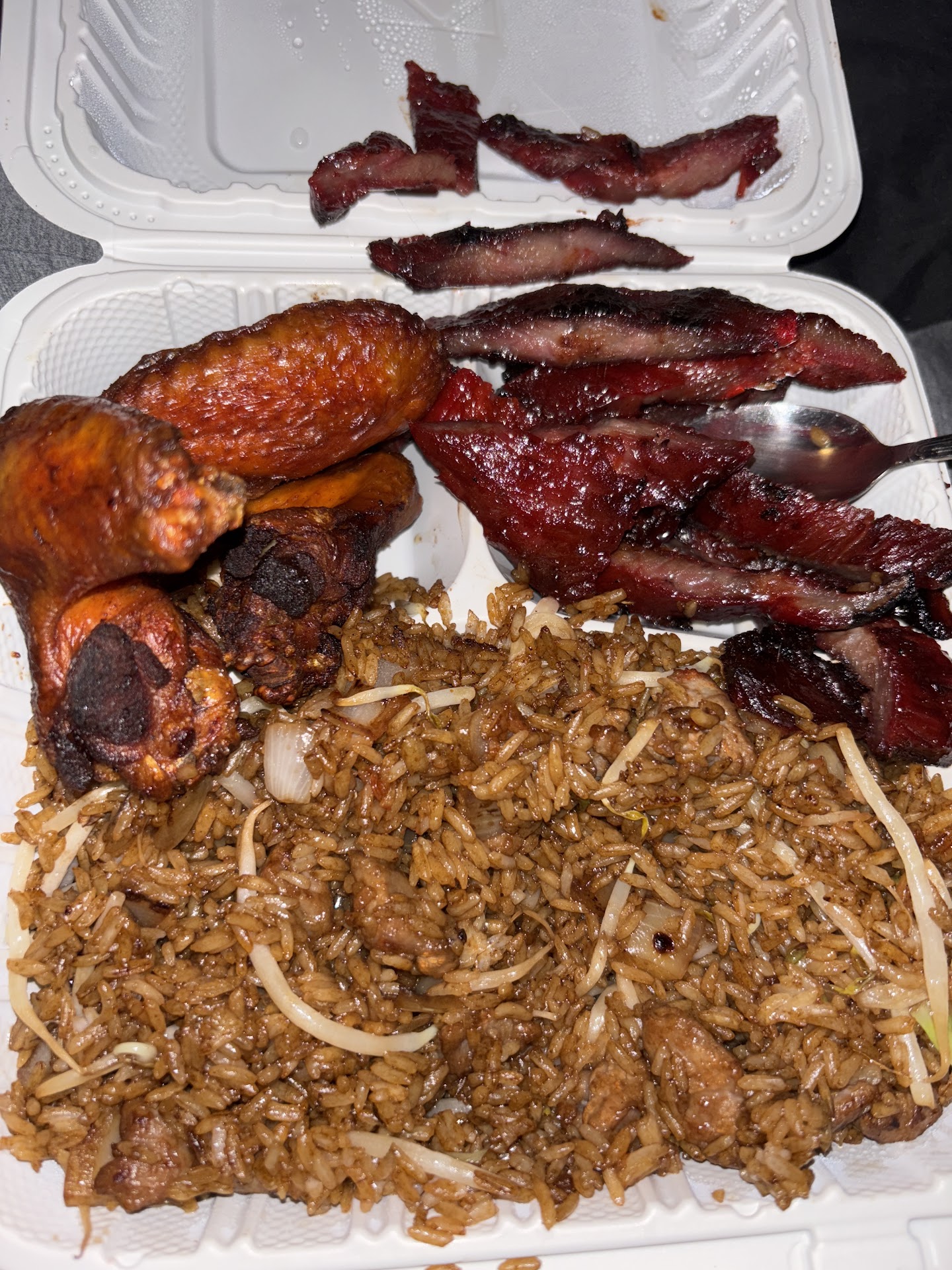 However whatever the detractors, the positives far outweigh them. The chicken, though white meat which is usually not my fave, was prepared and fried perfectly and was both juicy inside and crispy outside. The amount of sauce was just right. Four rangoons came with the combo meal which seems reasonably generous, filling tasted just right. I also upgraded the combo with a second app accompaniment— got an egg roll which was just right with cabbage and pork filling. Duck sauce was not too sweet and had that nice hint of fruit flavor that reminds me of applesauce— just right. Fried rice was not mushy nor was it dry, just right, with a wonderful little bit of smokiness/molasses flavor, a little bean sprout and a sprinkling of nice pork pieces.
