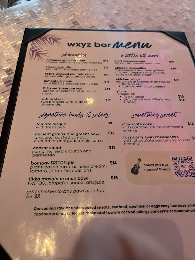 Read moreI arrived for a conference and it was late so I decided to just eat and have a drink at the hotel bar. It was fairly empty and I was greeted immediately when I sat down. I ordered a Moscow mule and the chicken bacon ranch pizza. Despite no one being there, it took a while for me to get my drink. It was strange now having a mule in a copper mug and it was mostly ginger beer. The pizza came out quickly and was pretty good. The pizza is what made my night at the wxyz bar. The bartender never came by again until I sat there staring at the bar for him to bring my check. If the bartender was more attentive to the guests then it would have been a much...
