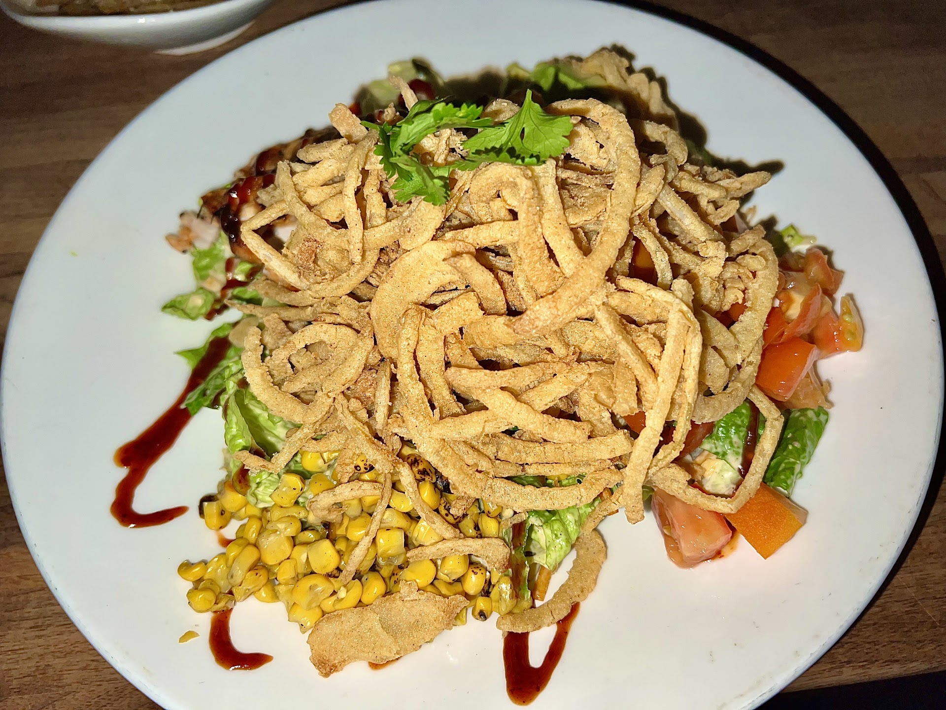 BBQ CHICKEN SALAD This salad is quite literally one of the best salads ever. It starts off with a base of mixed greens then you have the juicy, grilled chicken, the freshly sliced avocado, pasilla, charred corn, sprinkles of cheddar and monterey jack, some slithers of tortilla strips, diced tomatoes, pinto beans, cilantro and topped with fried onions. You can opt out of the fried onions if that's not your thing, but they're totally mine! Think of thin, but crunchy onion rings which is exactly what's on this bad boy. Oh and it's dressed in this really tasty chipotle ranch. I usually get the dressing on the side because I like to control how much dressing I have on my salad, just a personal preference. Now, get a little of everything into one bite and I'm telling ya just an explosion of flavors and textures in your mouth. UGHHHH it's sooo delicious. I could literally eat this everyday. Love it!