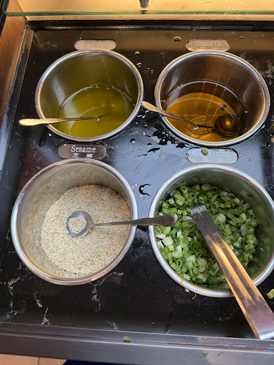 There's also a sauce bar with a large variety of do it yourself sauce ingredients like various oils, vinegars, garlic, soy, some prepared sauces, you can really get your potion crafting on at this sauce bar.