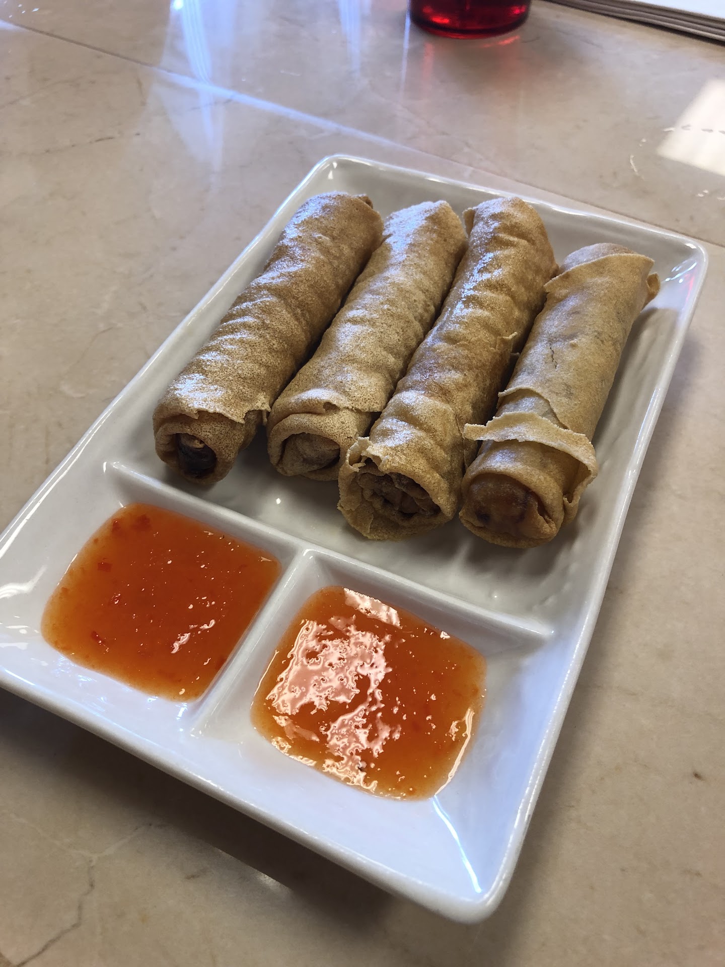 FOOD: Appetizers: Cha Gio (crispy egg rolls - mix of pork and carrots, onions, rice vermicelli wrapped in spring roll skin and fried gold brown. Served with fish sauce) $8.45 - 3 STARS: Not the best but not the worse. It reminded me of the Americanized egg rolls from Panda Express which isnt a good thing.