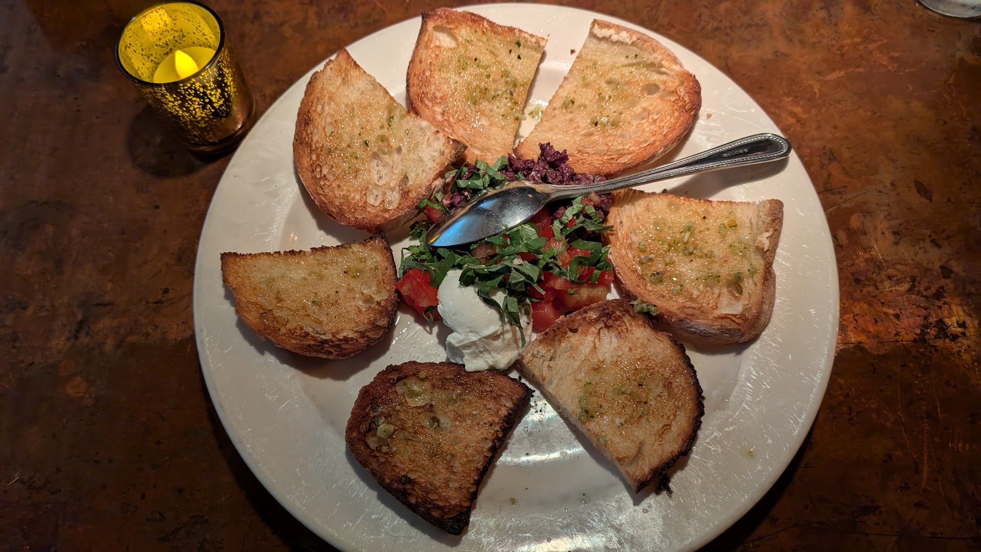 Food- The Good, The Bad, The Ugly. Starting on a positive note- the Good. Water:I ordered Pellegrini and it was served in a wine glass with a lime garnish. While I didnât ask for the lime I love that this is how itâs served. Refreshing and palate cleansing. Bread: Delicious, or as my daughter would say âItâs so Bus!â. I am told this is a culinary compliment of epic proportions. Iâm taking her word for it. It was served with a small accompaniment of oil and what appeared to be a sort of pesto-inspired mixture. It was delicious and all at the table were sad when it was gone. Dino nuggies and curly fries: in hindsight we should have all ordered this.