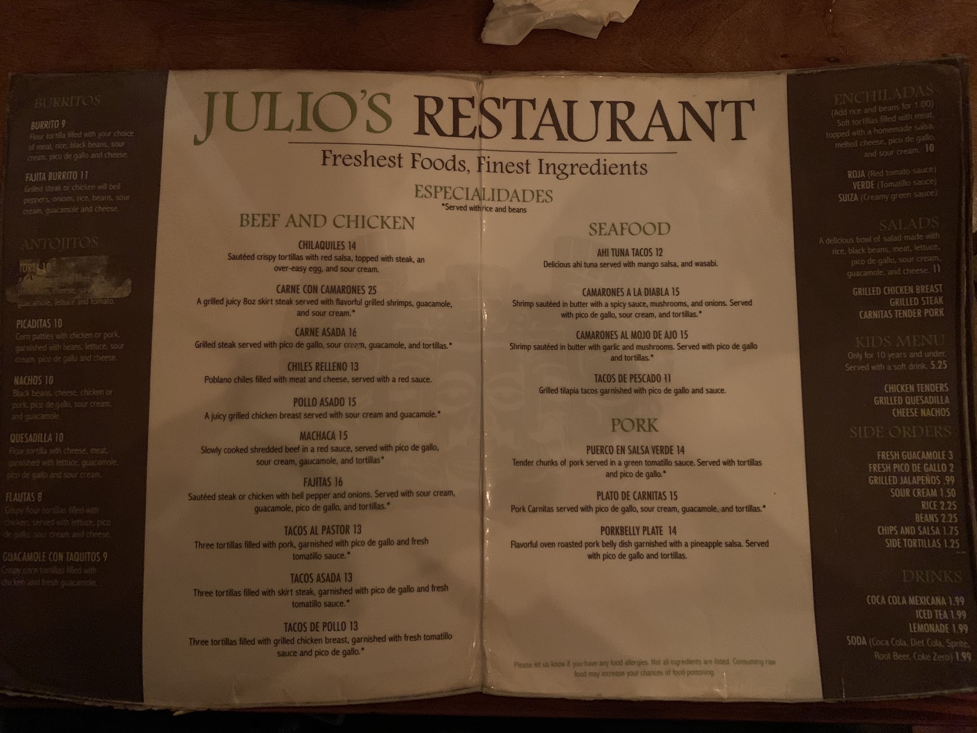 A friend recommended Julio's to me on the basis of a wonderful pre-pandemic meal there. She recoiled at the photos I showed her and the description of my meal; so it appears the quality has taken a nosedive since then.