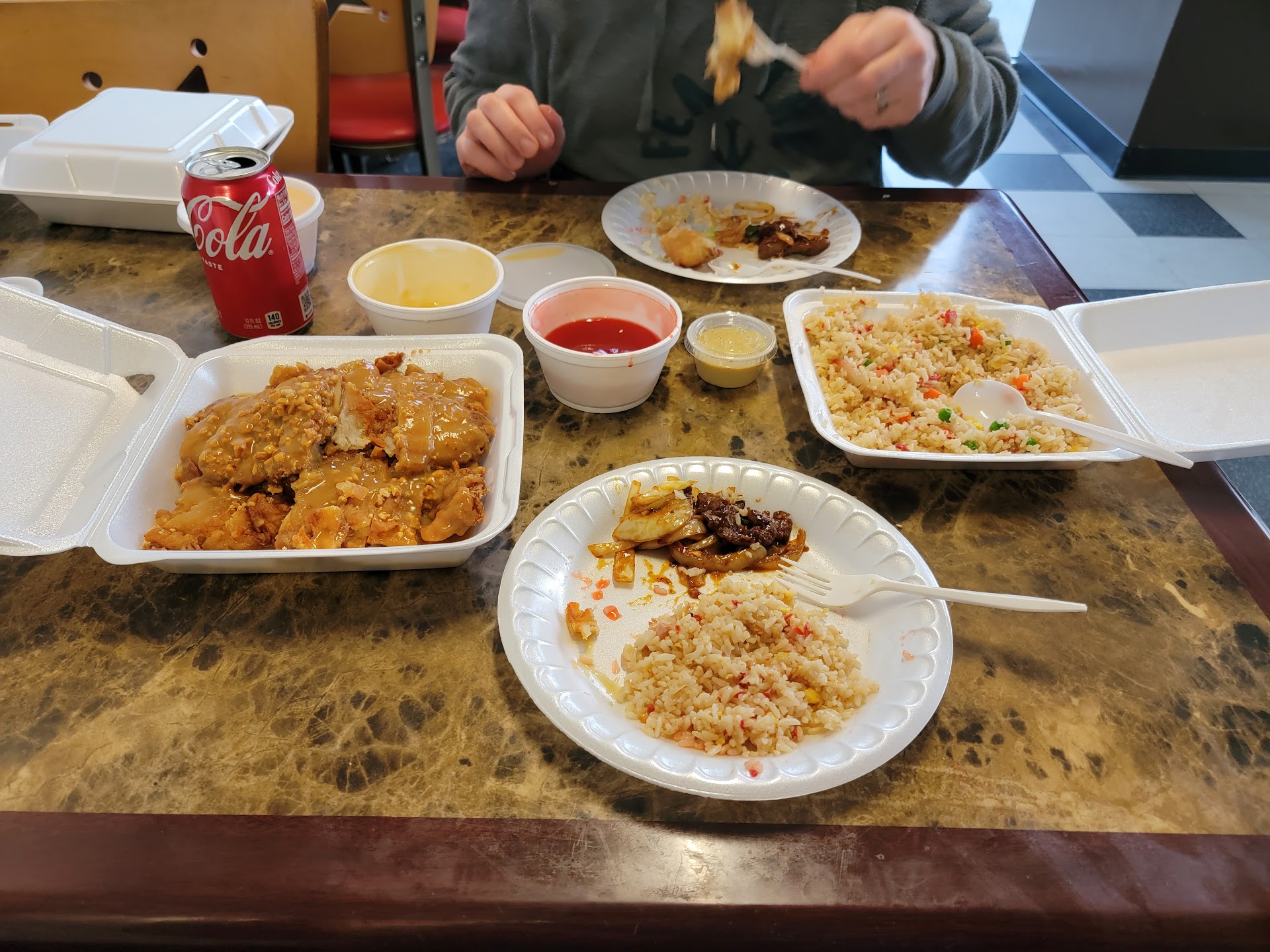 Read moreI have been there 2 times the first we ordered out and I remembered thinking that it wasn't great but it has been years since that experience and my normal favorite Chinese restaurant was closed so I thought I would give it another try. So sorry I did. The food was expensive and subpar to say the least. The bbq fried rice was good and the almond chicken was okay, and my husband said the spring rolls were good but the Mongolian beef was super rubbery and the sauce did not taste right, the crab ragoons should be called creamcheese ragoons because there was no noticeable trace of crab in them. The egg flour soup was so bland that I couldn't eat it... (yes I know egg flower soup is bland in general I LOVE egg flower soup normally this was just extra bland and had a weird taste to it) but I think one of my biggest complaints was for dine in service they served our food in Styrofoam to go containers, very thin cheap Styrofoam plates, all our soups and sauces were in Styrofoam containers and the utensils they gave us were the super cheap flimsy plastic silverware. Trying to dish up with those was a pain in the a** . They never once came to check on us or asked if we needed anything. When we went to leave they asked how everything was. We were polite and said fine but I will never go back. If I wanted to eat off cheap disposable plates and use plastic silverware I would just go to panda it would be way cheaper and the food would...