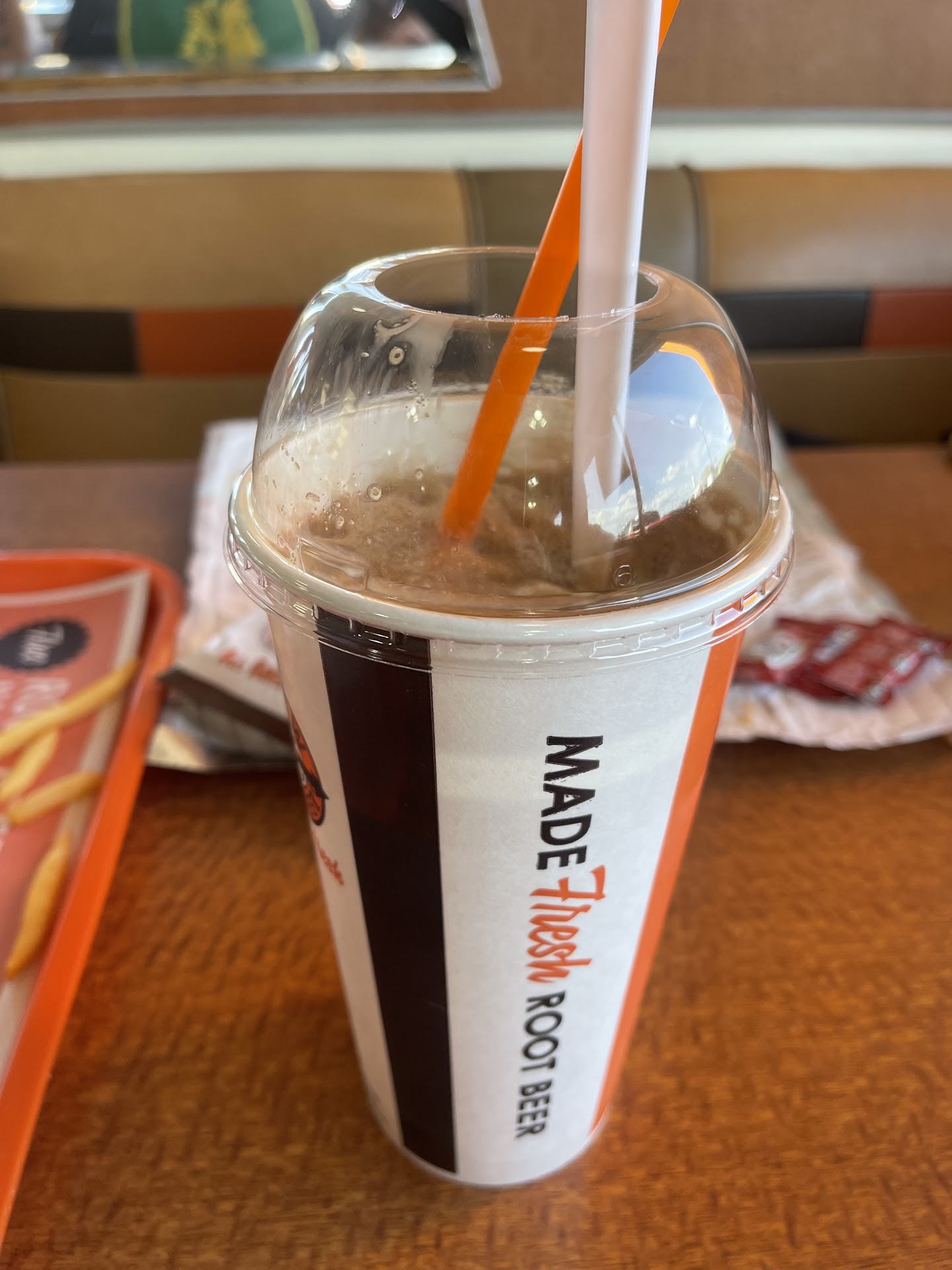 I've come here several times over the years , many with my son when he was younger , and the food has never been anything special and has gone downhill over the years. I got a Chili Dog and Onion Rings with my Float. The Chili Dog was one of the worst I've ever had. I've had them in the past and they were okay , but not today. The Onion Rings tasted like the cheap ones you buy at the grocery store , not good or fresh tasting , just bland. Also as soon as I put my straw in the float it started overflowing faster than I could drink making a mess on the table. I guess I broke the seal of the ice cream and there was too much root beer and the ice cream started to sink pushing up the drink. I had to get a stack of napkins to clean it up. After I finished mine i did get a Free Refill of the Root Beer.