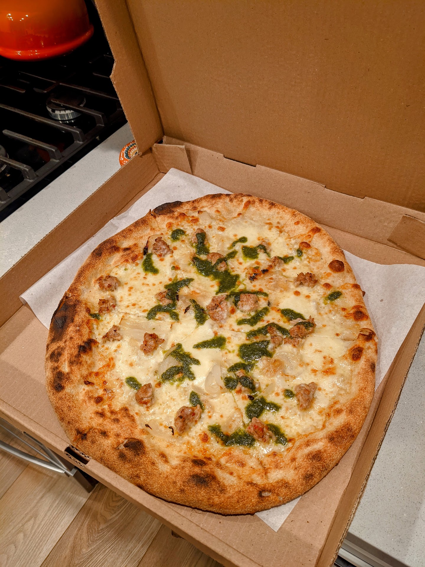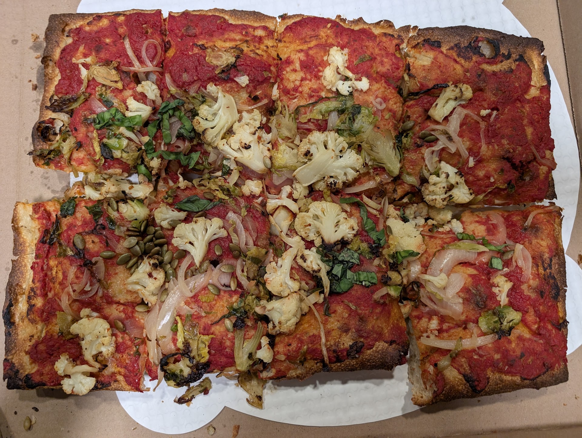 I ordered a white Sam and Sam and a red Spicy Pig + basil and mushrooms with Sicilian style crust because delicious. It arrived predicably hot and fast. That's precisely where my joy ended.