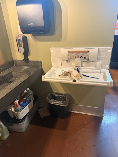 During our meal, I went to change my baby in the women’s restroom and found the only changing table in unacceptable condition: it was covered in used wipes, a used diaper, paper towels, and was next to a bucket of cleaning chemicals. Given the state of the facility, I made the decision to change my baby discretely on the ground, on a sanitary pad, near our patio table and behind our stroller.