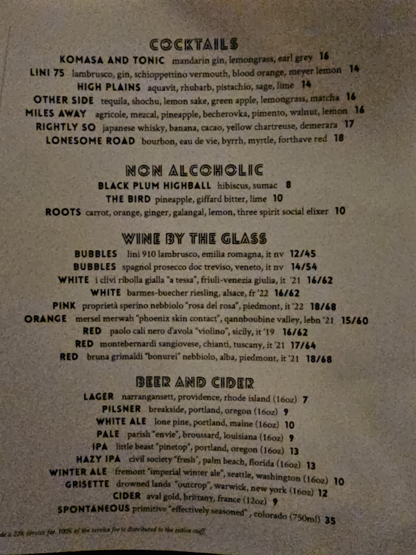 the ambiance is cozy and intimate and is well matched by attentive service in line with expectations. the menu was focused, relevant and interesting. It was perhaps a bit more ingredient forward than my little pallette is tuned for. a touch of salt and pepper on the table and turning everything flavor oriented up just a bit, would be welcome. the opt out 22% tip feels like a removal of power. yes please to fair wages, but also yes please to maintaining my autonomy without a staff facing opt out. for a 500 dollar meal, I want just a touch more flavor combined with feeling empowered to opt in to social norms and performance driven tip culture, rather than out.